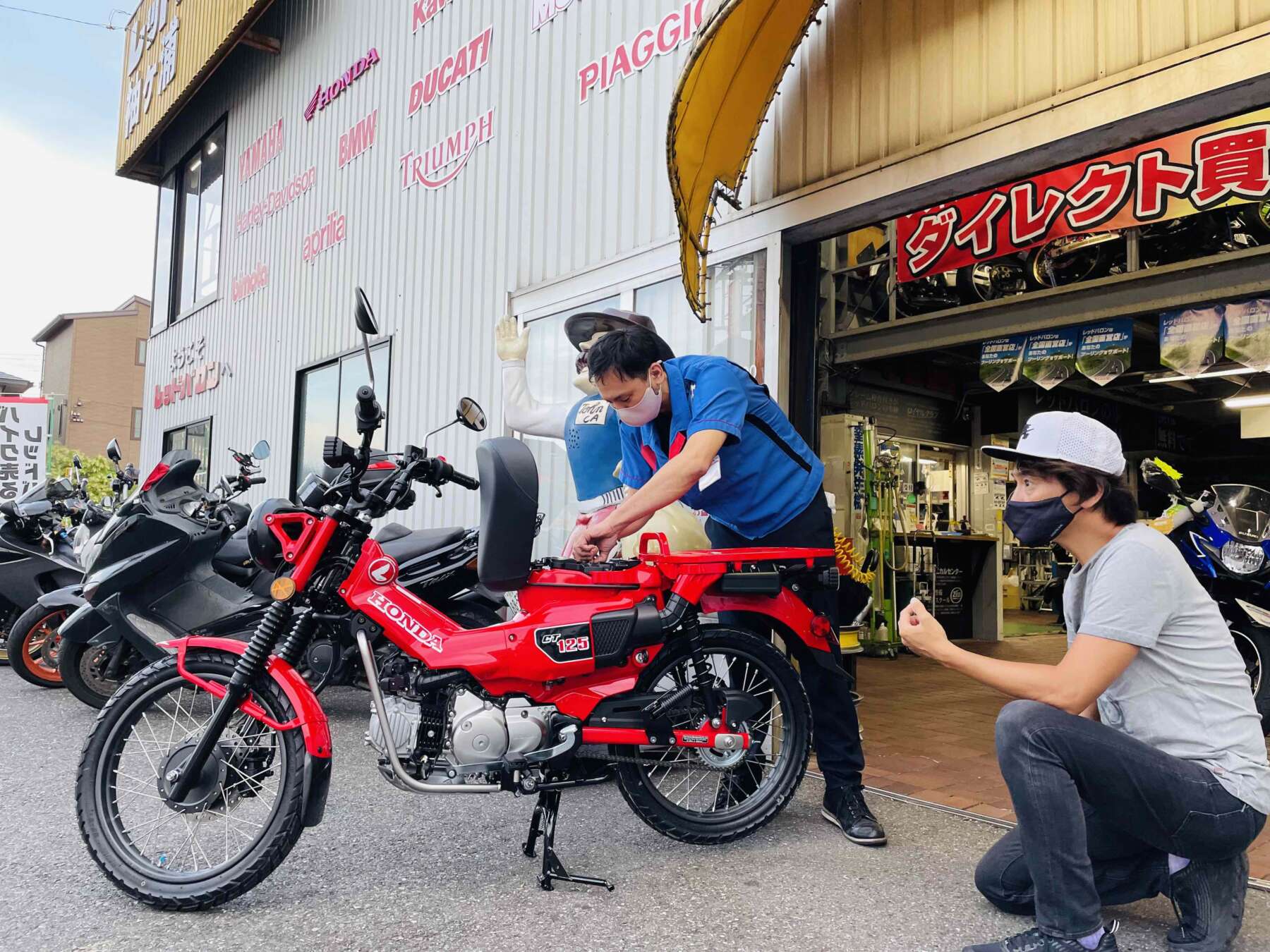 で、レッドバロン袖ヶ浦に注文していた、ハンターカブことホンダCT125が、ついにキタ〜!!のである。いま大人気で、かつコロナの影響により品薄となっているハンターカブは、場合によっては“1年近く待つ”とも言われている。僕も「早ければ8月か9月には……」と言われていたのだが、なんと7月末の某日、袖ヶ浦店の岡田店長から電話が……。