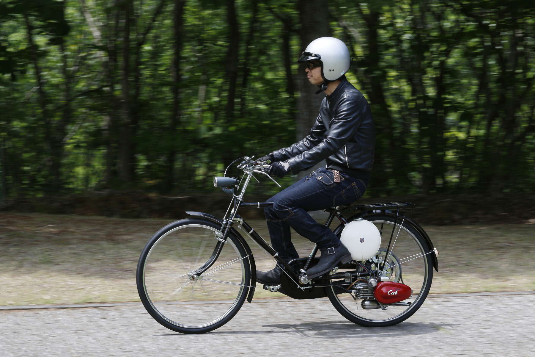 自転車用補助エンジンの最新作『カブF型』です。エンジンは軽量小型の2ストローク50cc。白いタンクに赤いエンジンのデザインで、見るからにスマートで可愛らしく、誰にでも親しめる雰囲気を持っていました。
