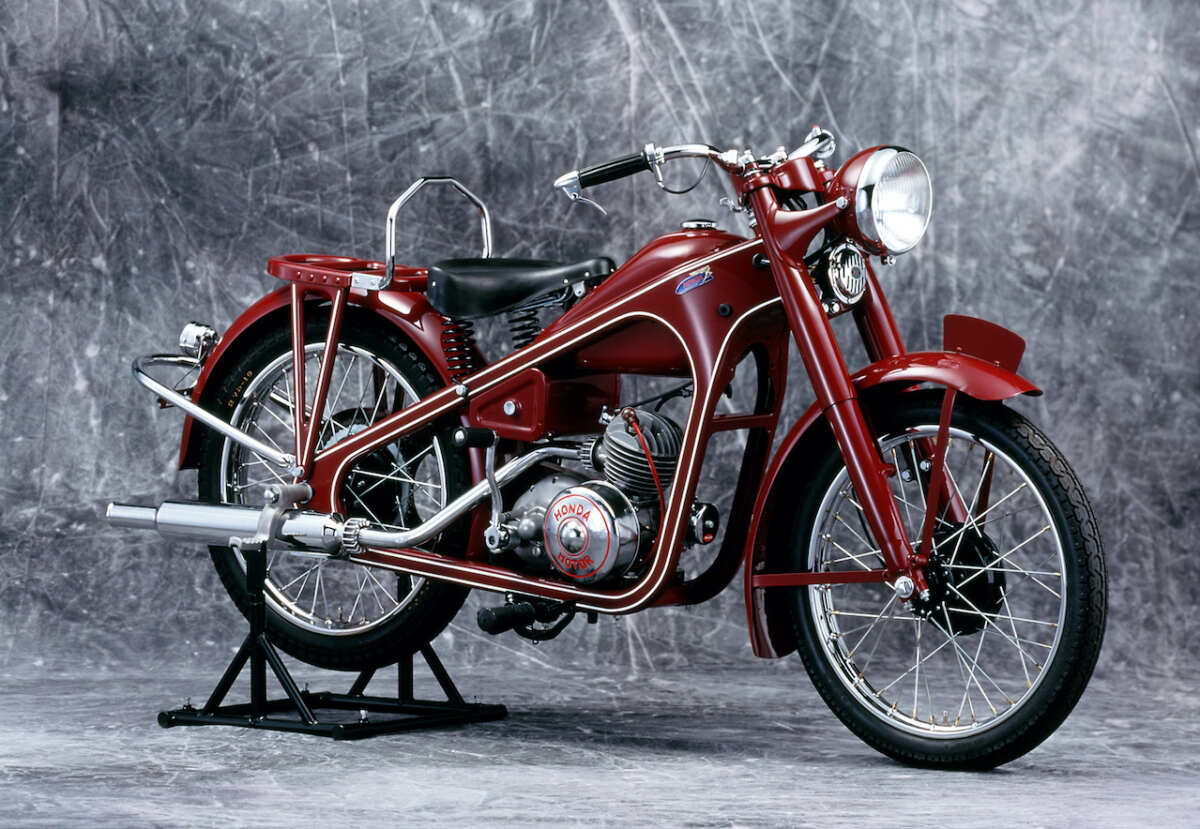 ▲ホンダ ドリームD型/1949年。自社開発第1号の本格バイクで、排気量98ccの空冷2ストローク・ロータリーバルブ単気筒エンジンは、最高出力3PS/5000rpmを発揮した。(画像:ホンダモーターサイクルジャパン)