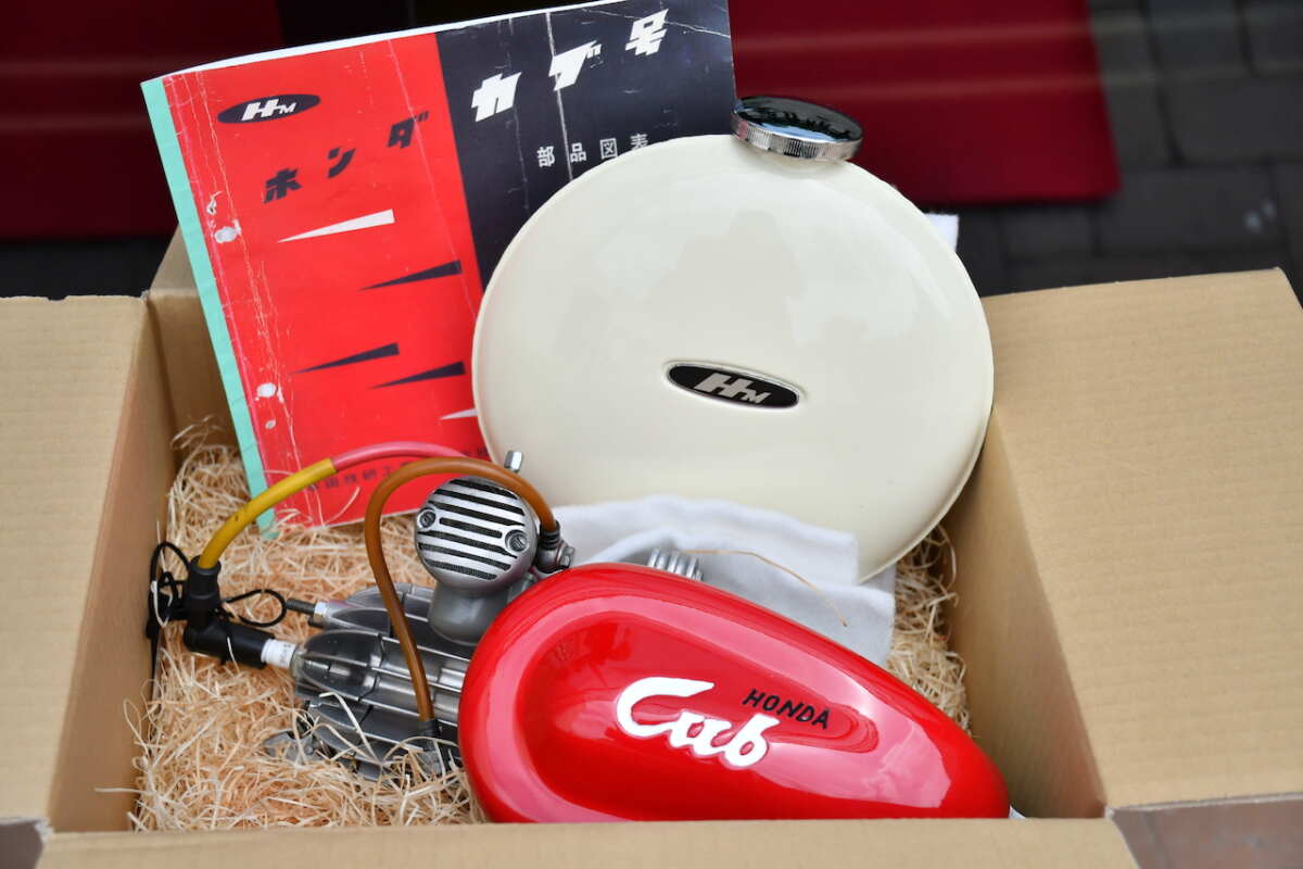 33×33×60cmのダンボール箱に、エンジン一式と燃料タンク、関係書類などを入れて自転車店へ発送し、直販。委託販売が常識だった2輪車業界で前金を払ってもらうというのも画期的でしたし、藤澤氏は月賦販売、つまりローンのアイデアも実現させました。