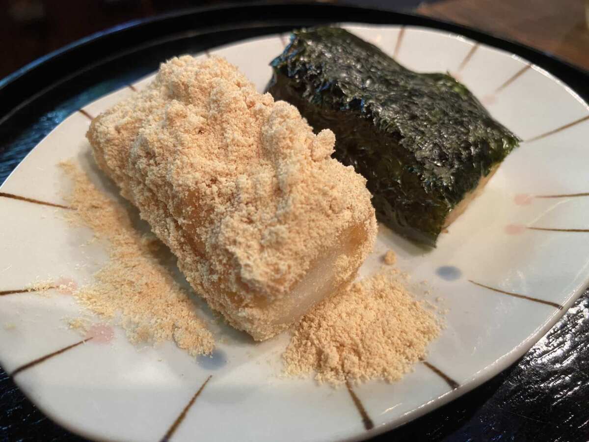 セットメニューにある「ミニおもち」は、磯辺餅とあべかわ餅の組み合わせが選べます。糀は味噌のほか、醤油やみりんなど調味料の材料になるもの。こうした糀屋は、江戸の人々の食を支えた存在だったのですね。