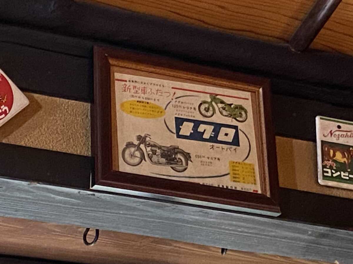 ボクは店内に飾ってある昭和レトロなものたちにも魅了されてやみません。特に好きなのはコチラ。メグロ125ccレジナ号と650ccセニア号の新型ふたつのフライヤーです。