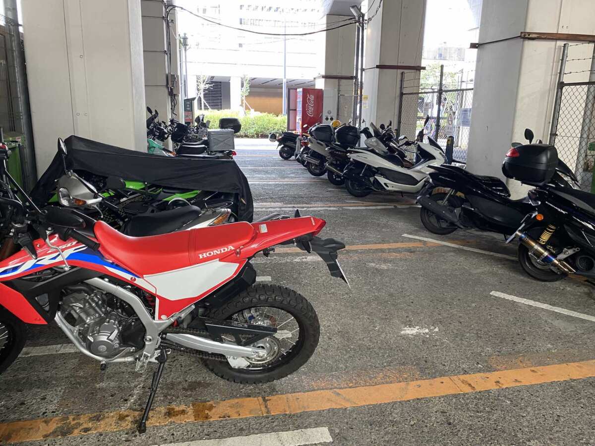 バイクは8:00〜22:00=1時間毎200円、22:00〜8:00=1時間毎100円で、当日24時まで最大1000円とのこと。コチラも線路の下なので、雨が降っても濡れません。