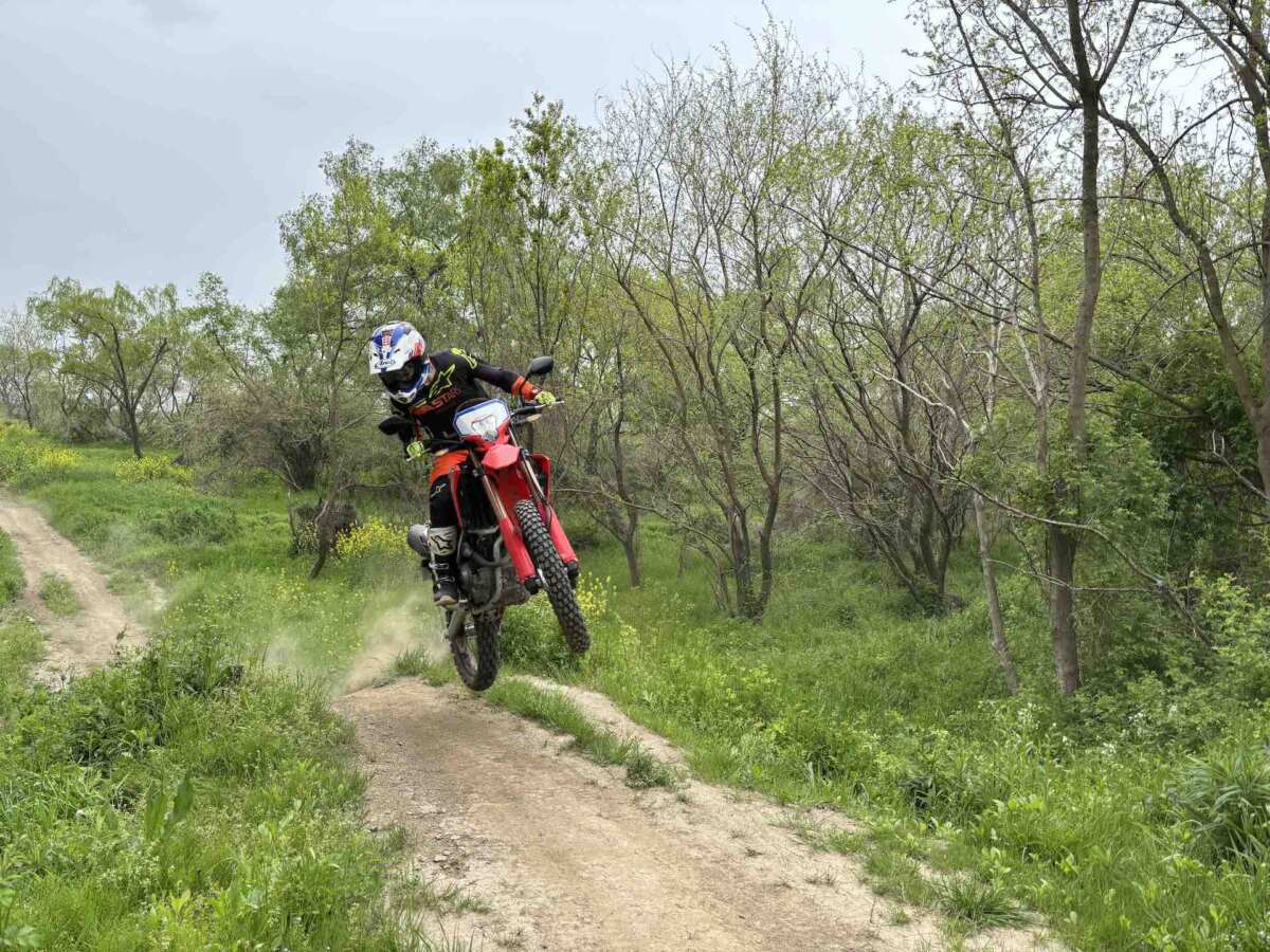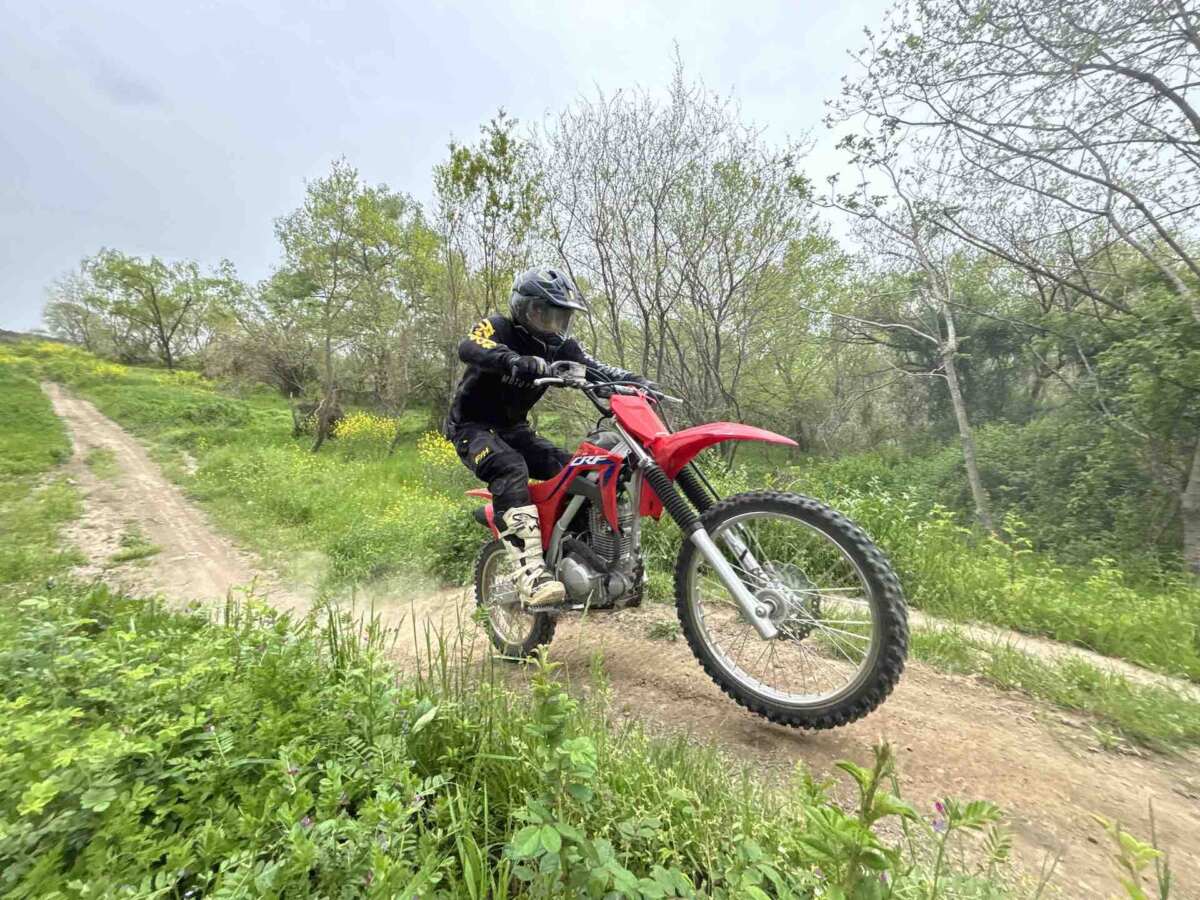 『CRF125F』はセルスターターが標準装備され、エンジン始動はボタンで一発。高剛性のツインパイプフレームに、インナーチューブ径31mmのテレスコピックフォークと分離加圧式ダンパー採用のプロリンク式モノショックを備え、なかなかよく走ります。
