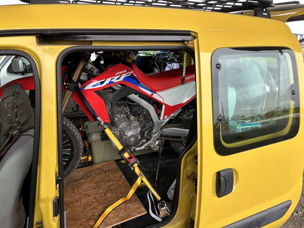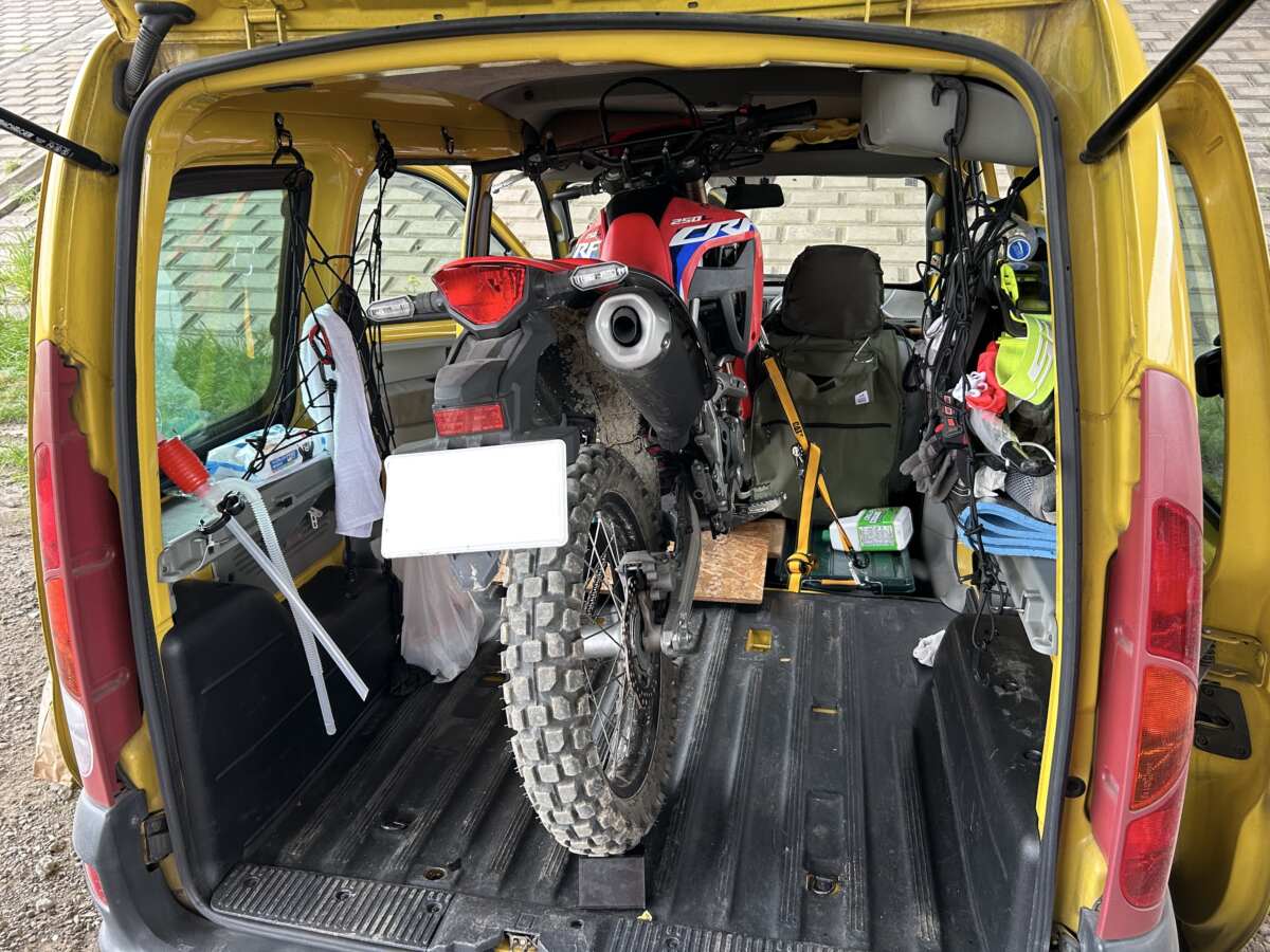 果たして、フルサイズのナンバー付き250ccオフロードバイクも積むことができるのでしょうか。雨が降ってきたので、この際『CRF250L<S>』で試すことにしました。