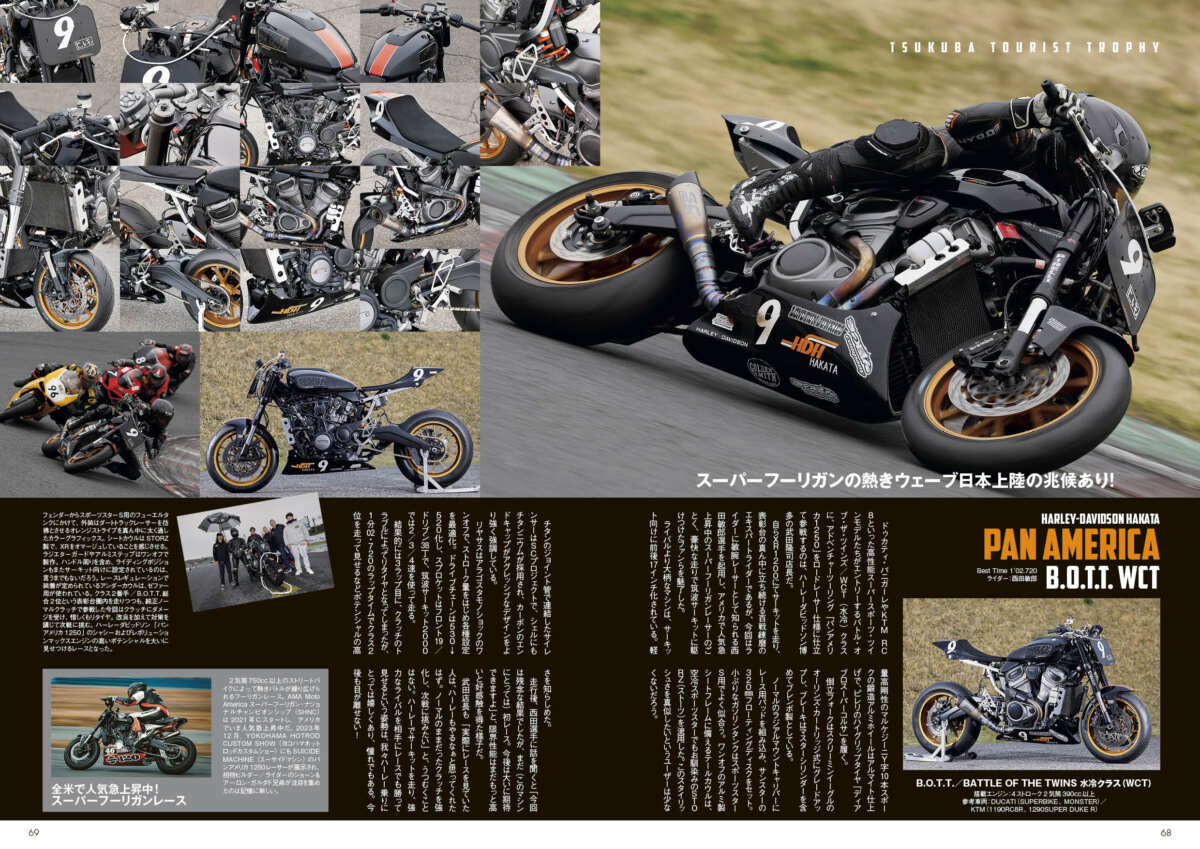 サーキットで取材したレース車両たちの記事にも、それは言えるでしょう。アメリカで流行するスーパーフーリガンレースにヒントを得てマシンづくりが進められているのは『PAN AMERICA1250』をベースにしたロードレーサーです。