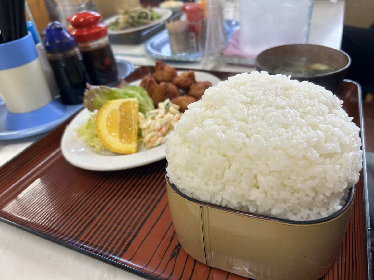 ココもなにを食べても旨いし、なによりボリュームがものすごい。定食を頼んだときのゴハンの量はハンパなく、普通盛りでも下の写真の通りどっさりきます!