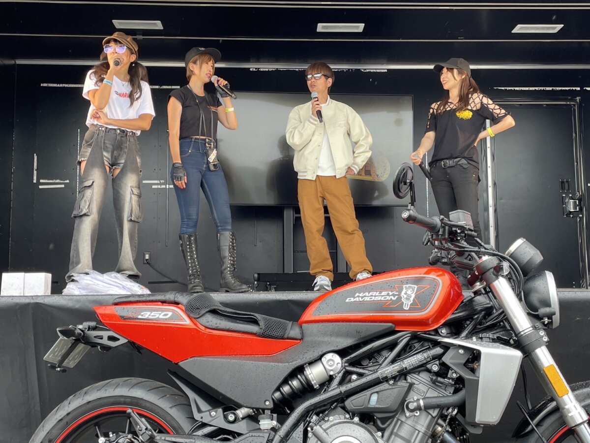 ▲ハーレーダビッドソンジャパンの公式イベント「ブルースカイヘブン2024」では、トラックステージにてハーレー女子たちとトークショー。左からメリーローズちゃん、秋田ライダーえむちゃん、青木タカオの右はポポちゃん。みんなハーレー乗りです。