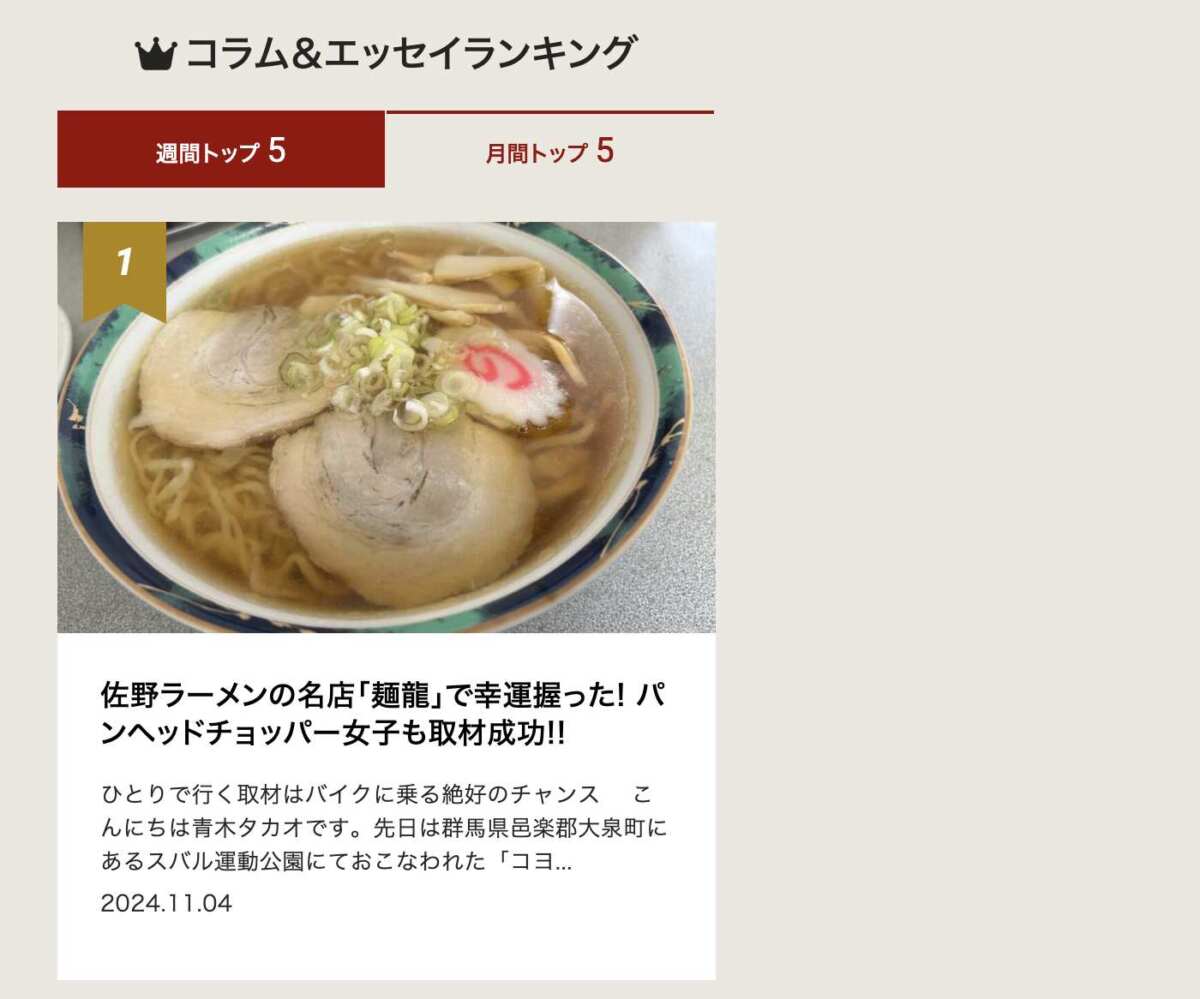 うぉー、PVランキングで総合トップ! 嬉しいではありませんか。こんにちは青木タカオです。先週公開しました【佐野ラーメンの名店「麺龍」で幸運握った! パンヘッドチョッパー女子も取材成功!!】の記事が、こちらForRで週間総合トップ、つまり最も読まれましたものとなりました!!