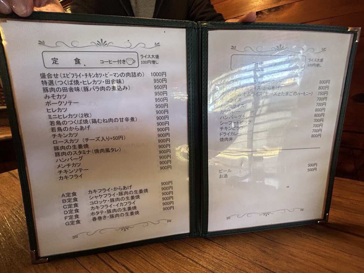 さぁ、迷いまくります。すべてがライス付きの定食になっていて、さらにコーヒー付き。文字だけのメニューを眺めつつ、幸せな妄想モードに突入します。