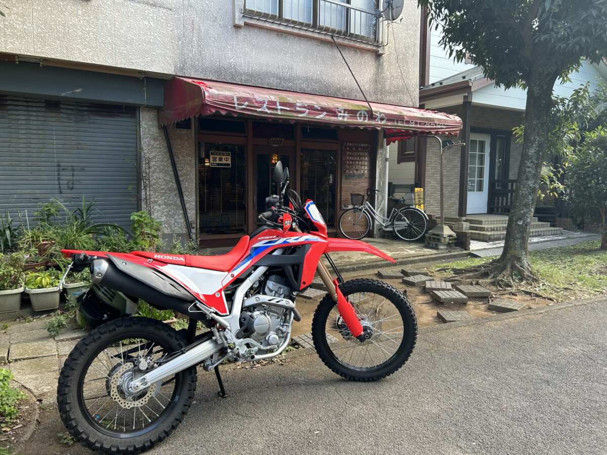 クルマやバイクを置くスペースはありません。目の前は歩道なので、CRF250Lを押してきて記念撮影。お店が一段落したご主人が「大きいバイクだねぇ」と、にっこり話しかけてくれました。