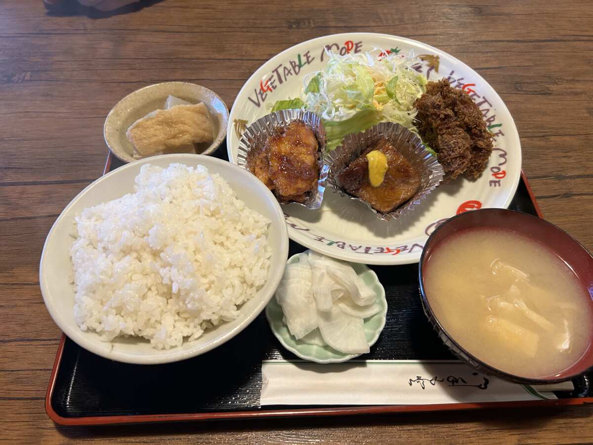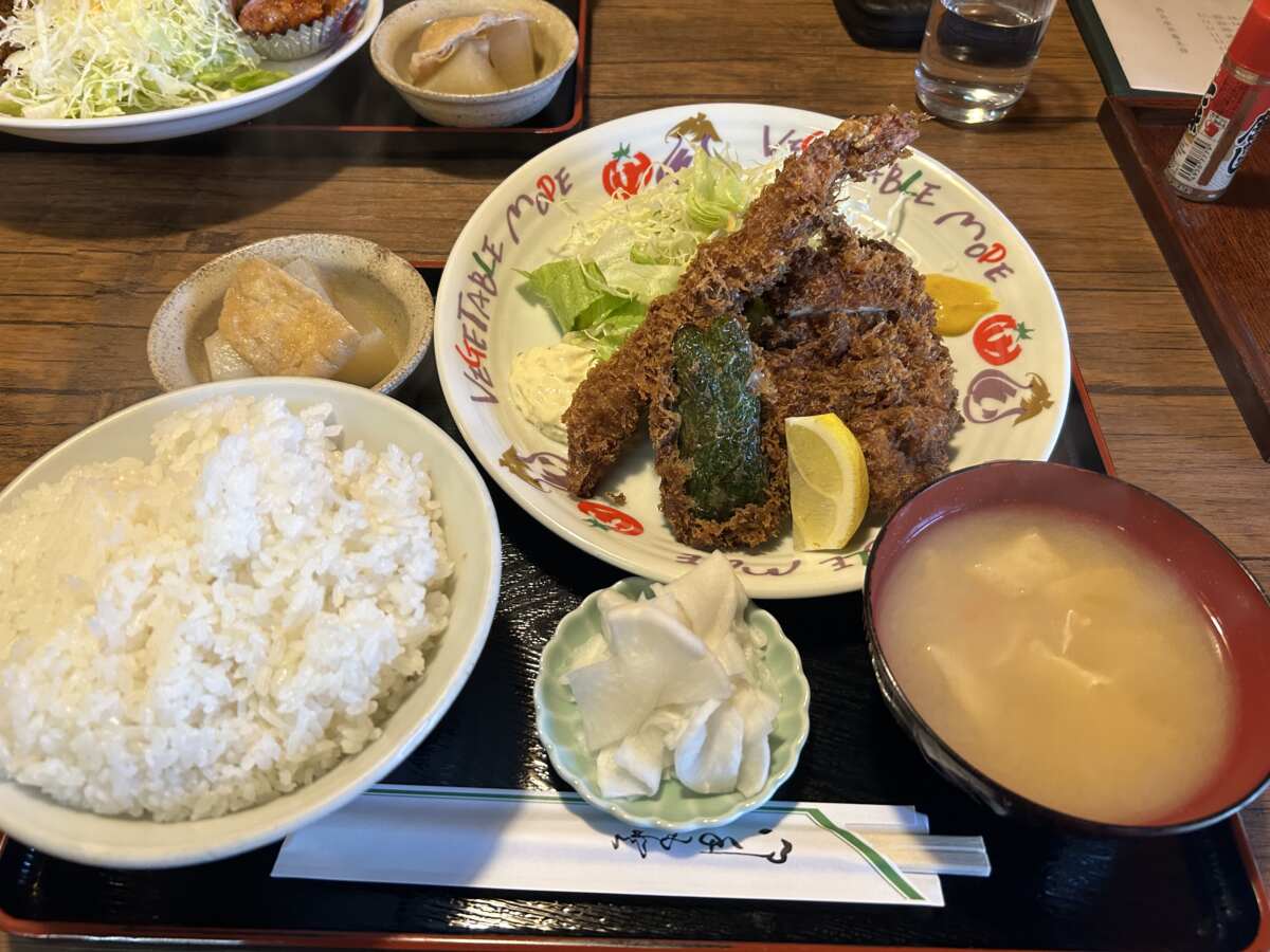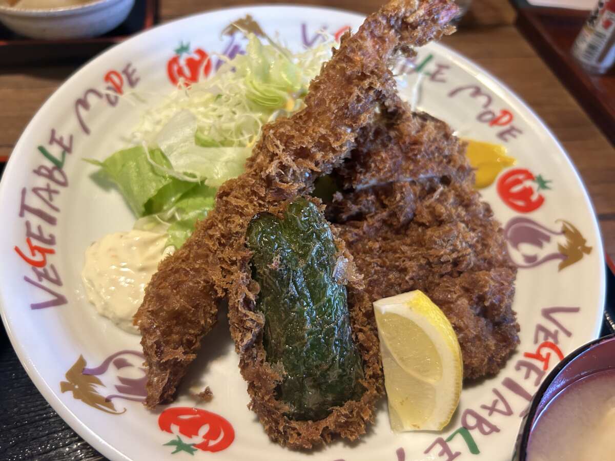 ようやく結論が出ました。最高峰の「盛り合わせ」(1000円)を頼めば、エビフライ、チキンカツ、ピーマンの肉詰めと、いろいろと食べることができます。