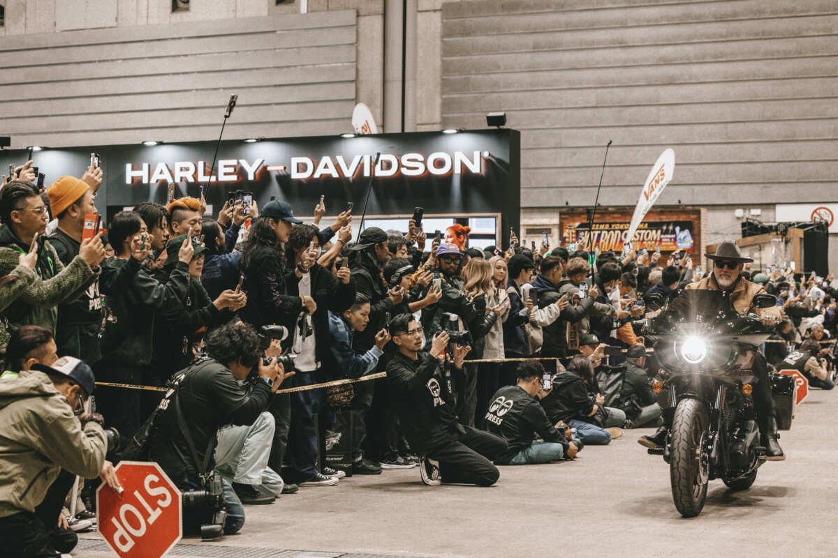 また、イベントのスタートを告げるライドインショーでは、米国H-D本社デザイン部門のトップ Brad Richards 氏がローライダーST タバコフェードに乗って登場しました。