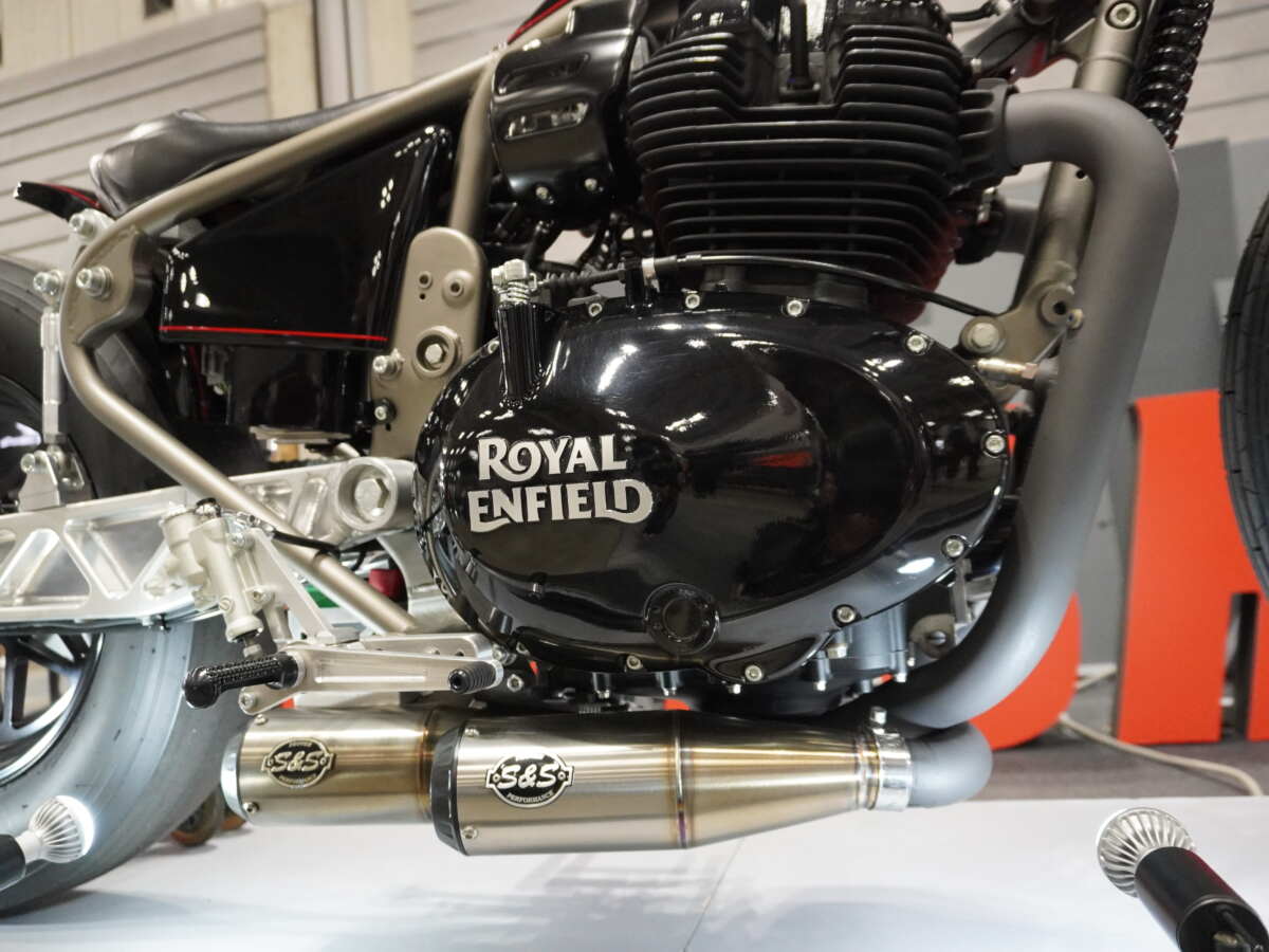 ベース車両は「SUPER METEOR 650(スーパーメテオ・ロクゴーマル)」。リジッドフレームが美しいシルエットを魅せ、フロントエンドにセットしたガーターフォークにはエアサスペンションが組み込まれています。