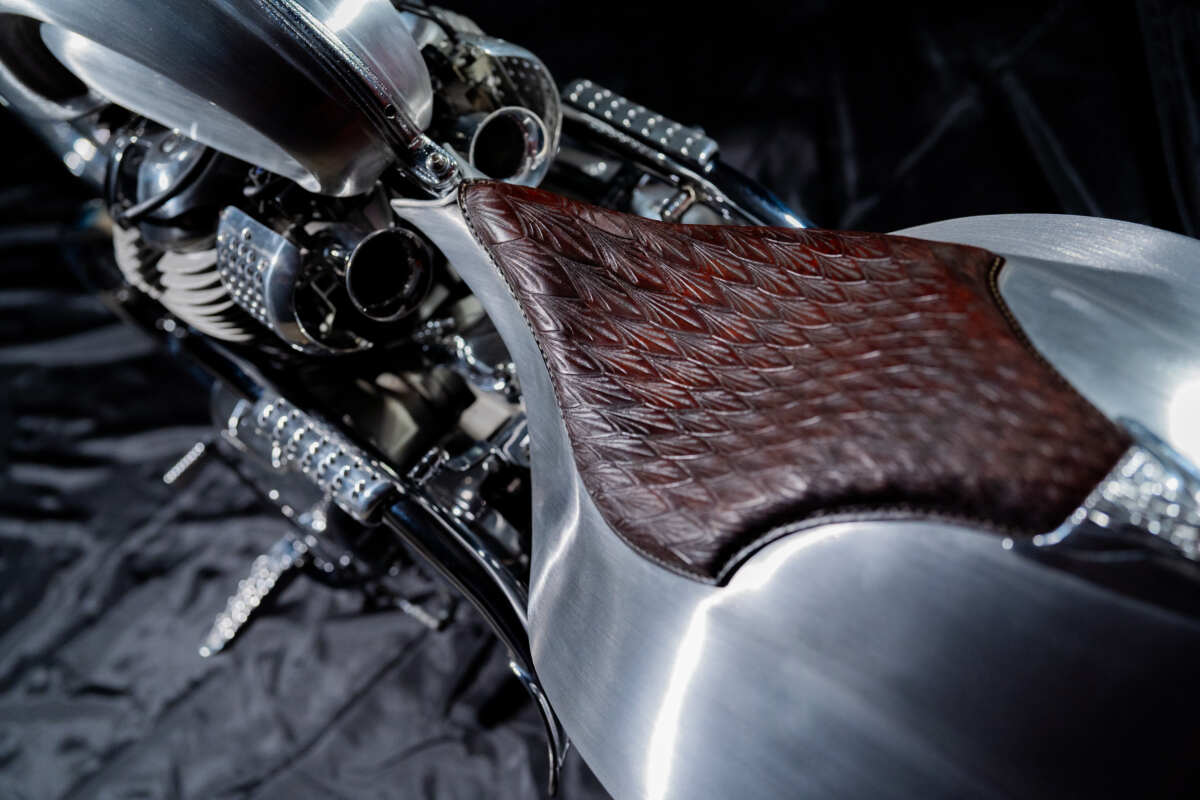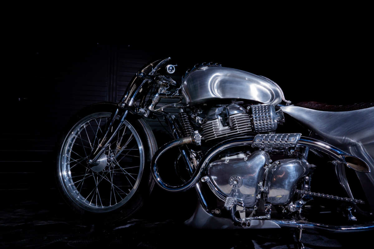フロントフォークやトリプルツリーなどはショットガン650のスタンダードを加工。前後ホイールやスイングアームはアルミ削り出しでワンオフ製作され、フロント21/リア16インチの足まわりとしています。