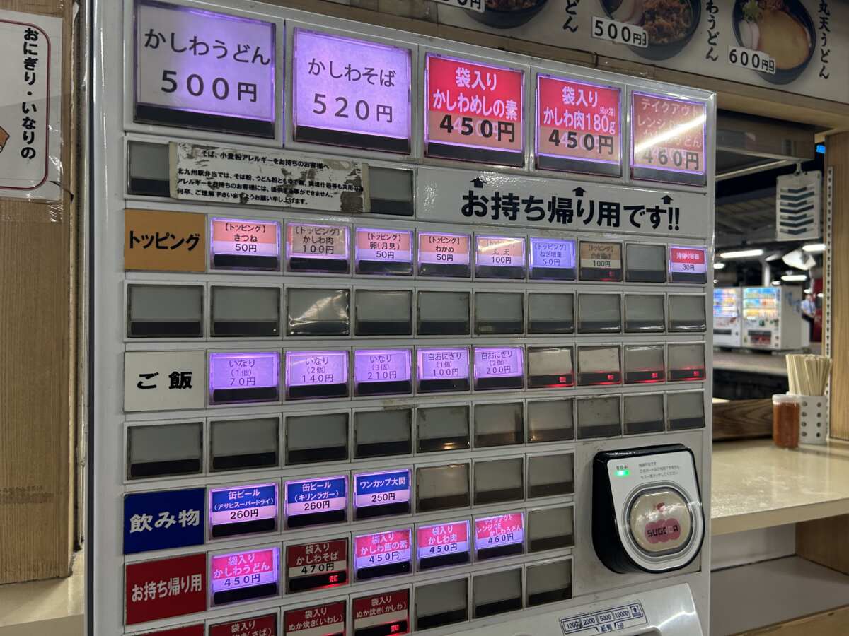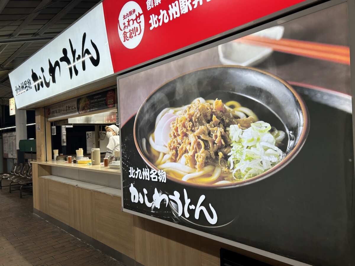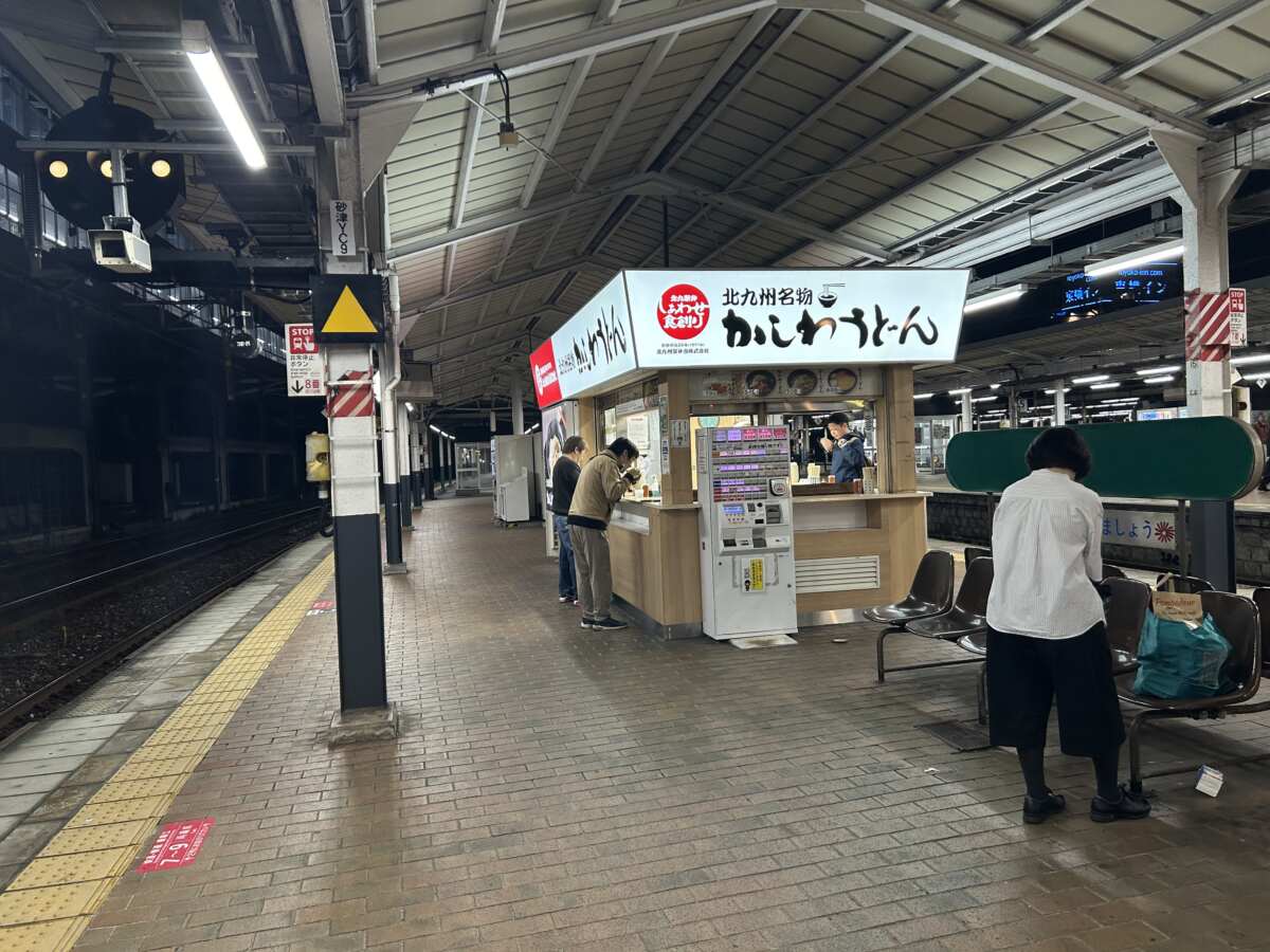小倉駅に戻り、北九州のソウルフードとして名物となっている「かしわうどん」をいただきます。在来線1・2番ホームの1号店と、7・8番ホームの2号店があり「どっち派」と言われるほどどちらも人気があります。今回は7・8番ホームへ。