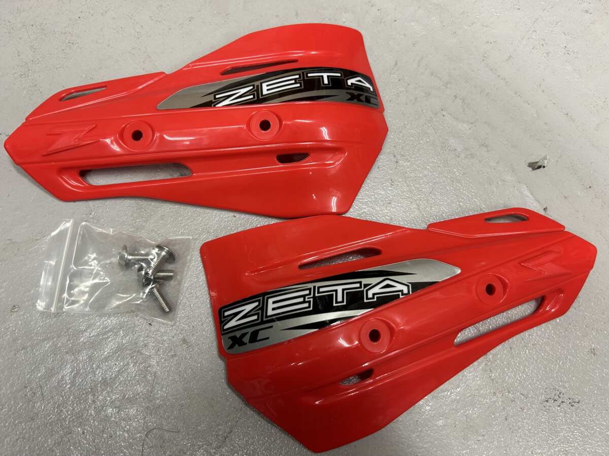 前方からの泥除け、草木を掻き分けて走る際に手を守ってくれますし、小さいながらも防風効果もボクは期待しています。メーカーを揃えるのは、言うまでもありません。車体色に合わせて赤をチョイスしました。