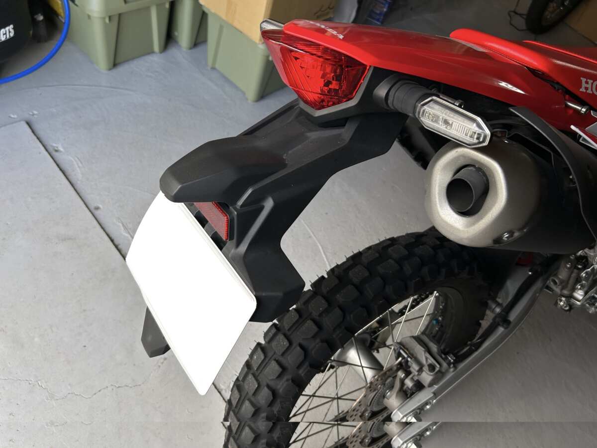 購入したのは『DRC モトレッド エッジホルダーキット レッドレンズ CRF250L/RALLY '21-23用』です。純正フェンダーと交換するだけで大幅な軽量化を実現でき、平成33年/2021年の新保安基準適合とのことで選びました。