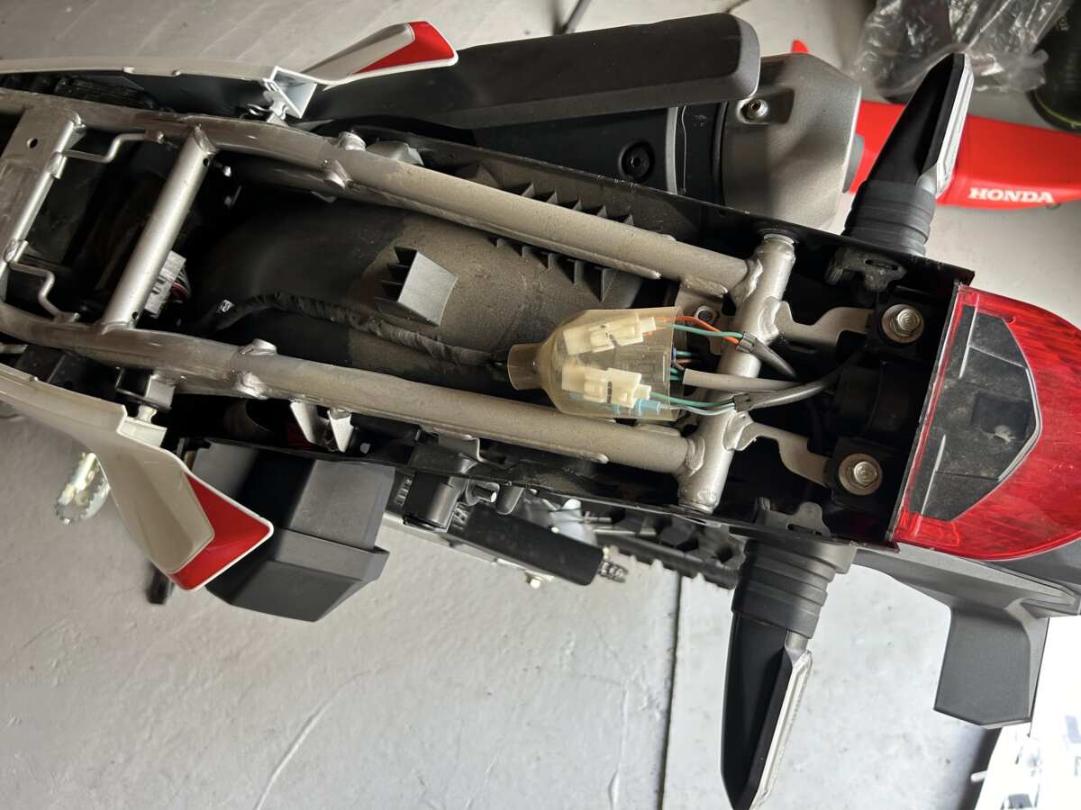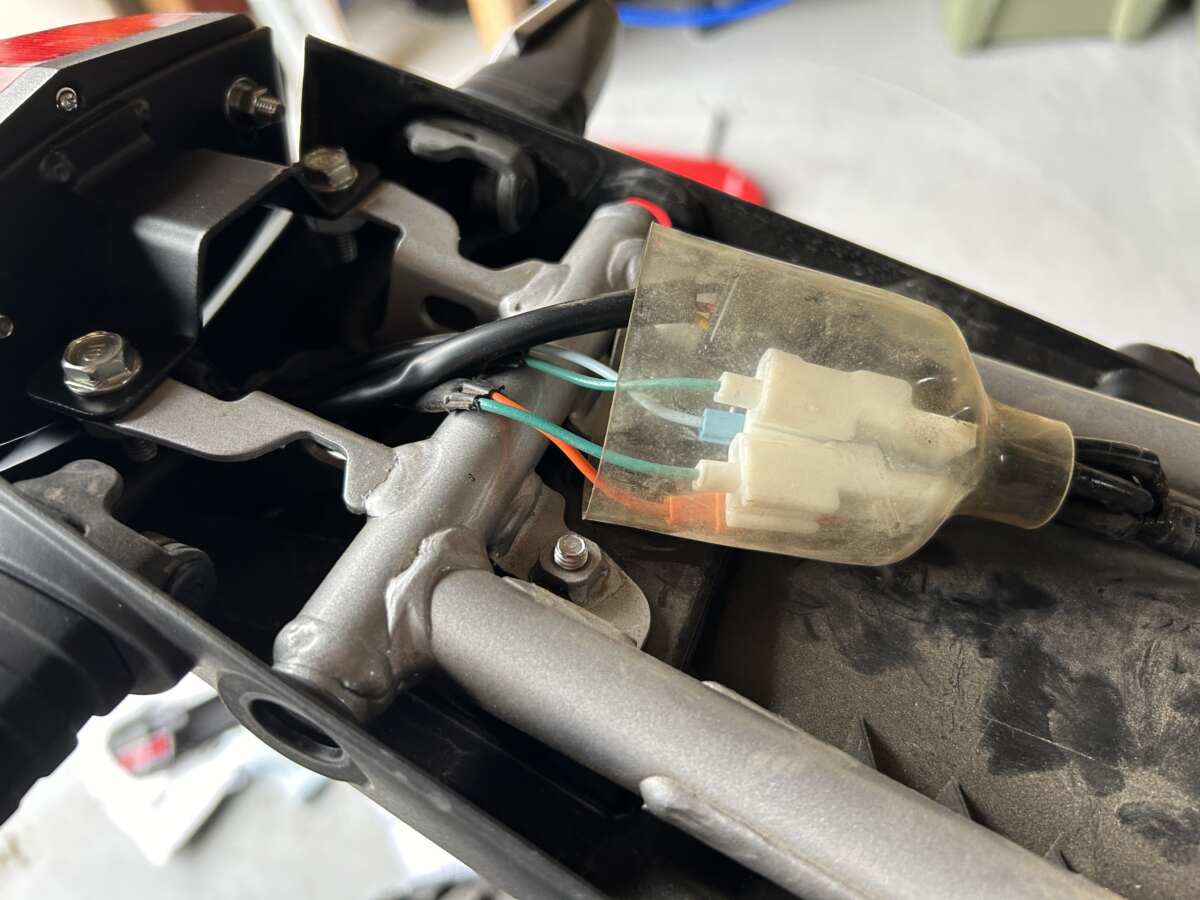 リアまわりの外装を取り払うと、オフロードを走っているせいでしょう、とても汚いことが判明しました。しかしこれは見て見ぬふり。ざっと掃除するだけで作業を進めてしまうボクでした。