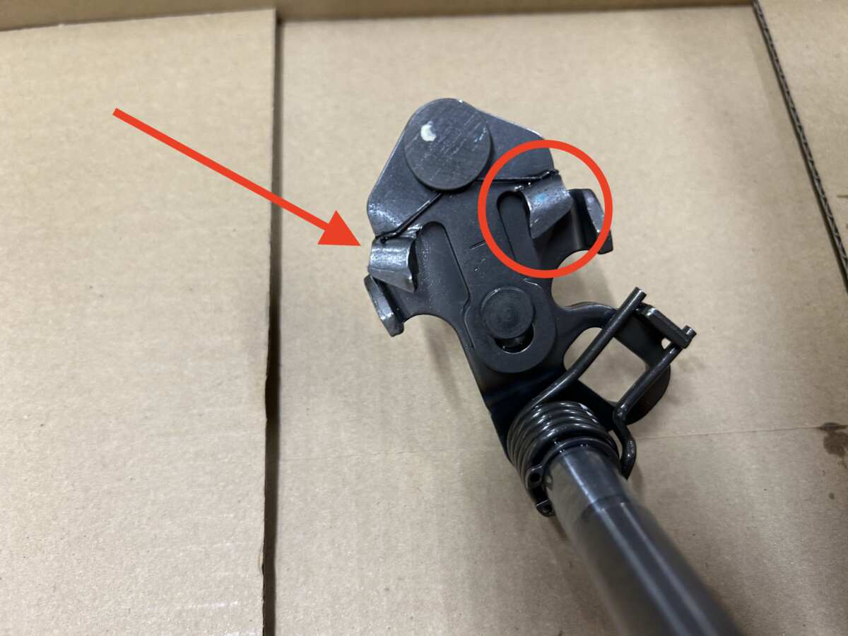 しかし、地面にハンドガードを強打したため、ハンドガードが上へずり上がり、ワイヤーごと引きあげたままになってしまっているではありませんか。樹脂製のハンドガードは割れてしまいました。