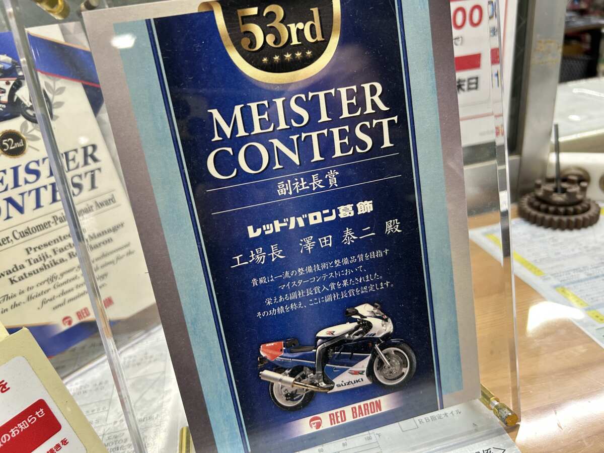 ちなみにレッドバロン葛飾の澤田工場長は、一流の整備技術と整備品質を目指し、レッドバロンが社内でおこなっている『MEISTER CONTEST(マイスターコンテスト)』において、栄えある副社長賞に入賞を果たした凄腕メカニックです。