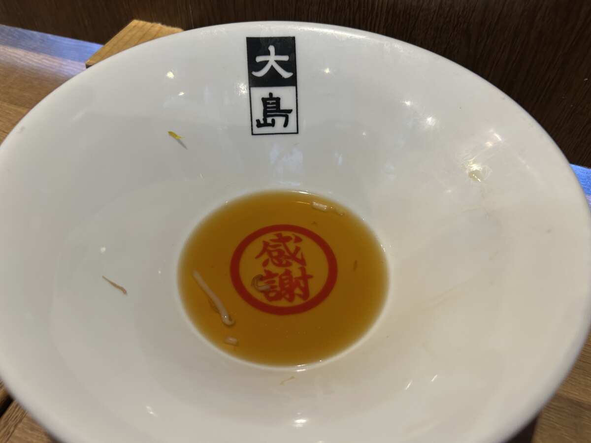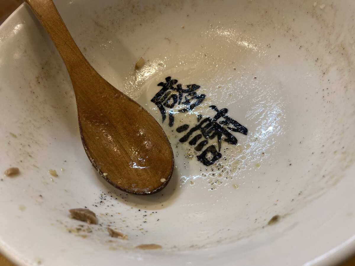 ラーメンはスープも含めた料理。誰がなんと言おうと、ぜんぶ頂戴いたします。どんぶりの底にある「感謝」の文字を確かめてニンマリ。この日も大満足でした。