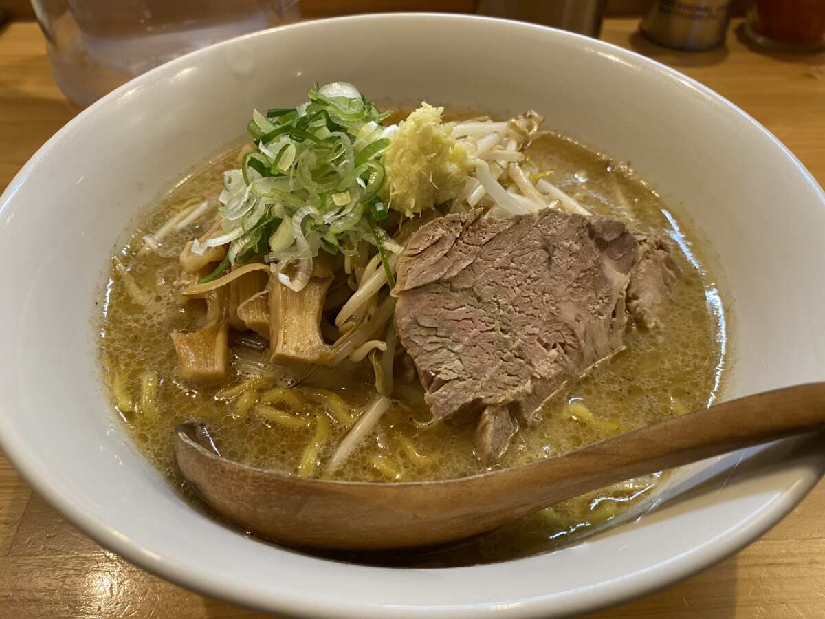 縮れたまご麺に、チャーシュー、もやし、メンマ、ネギ、すりおろし生姜が入っています。スープから口に入れると、香ばしい味噌の香りとまろやかさ、豚の旨味やニンニク、さらにオニオンが深みと甘みをプラスし、うぉ〜、何度いただいても毎回めちゃくちゃ美味い!!