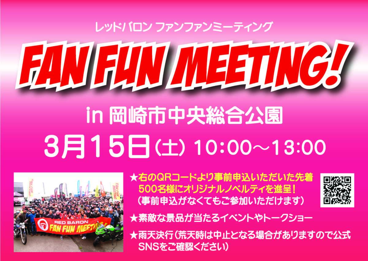 まず3月15日(土)10:00~13:00は、愛知県岡崎市の岡崎中央総合公園で「レッドバロン」主催のユーザー参加型イベント「2025年 第1回 Fan Funミーティング」が開催されます。