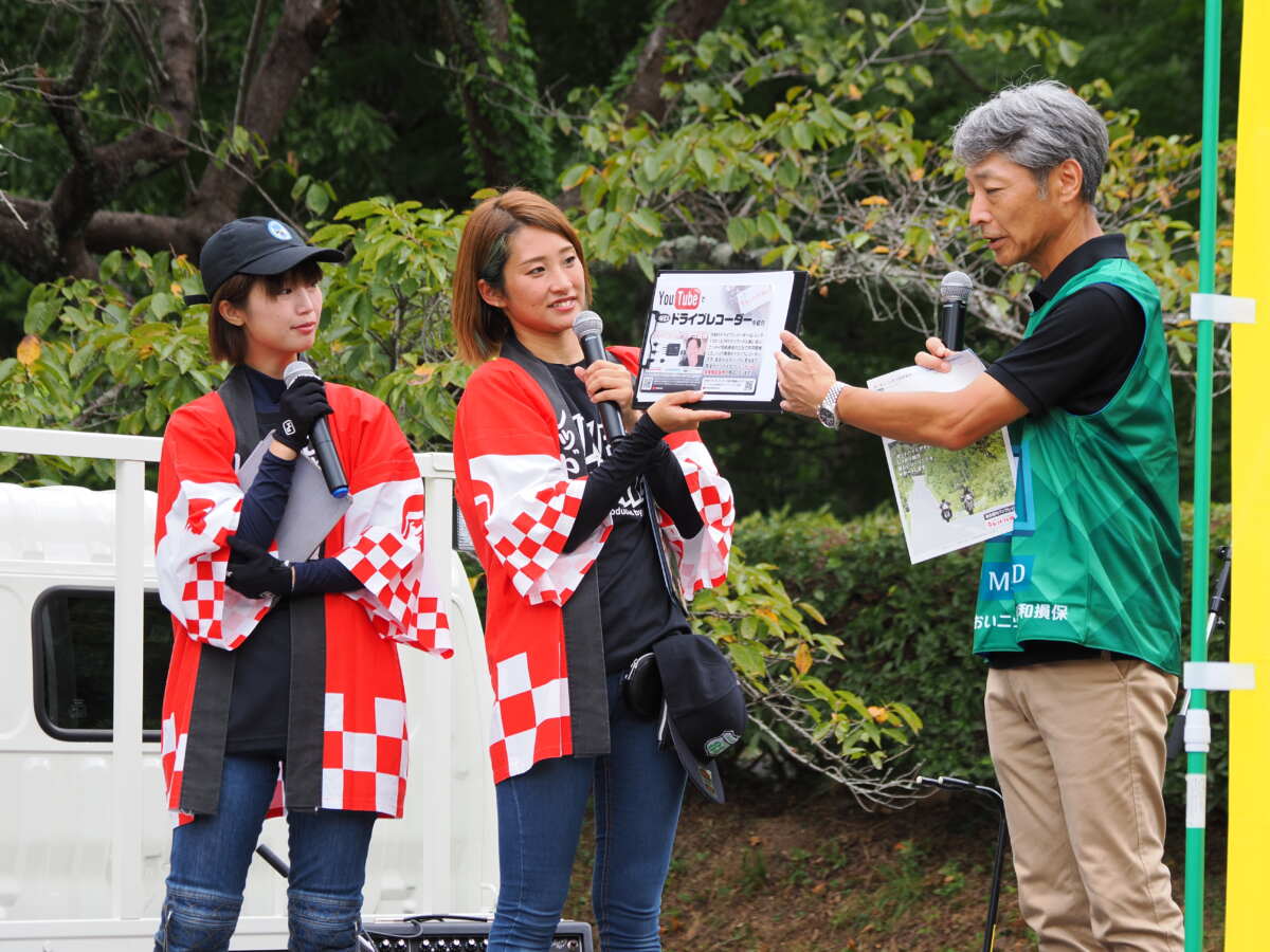 ▲YouTubeチャンネル「レッドバロンmovie」でもご出演されています、たはらかすみさん(写真中央)やバイク声優の難波祐香さん(写真左)のトークショー、豪華景品がもらえるジャンケン大会も大人気。撮影:宮下豊史