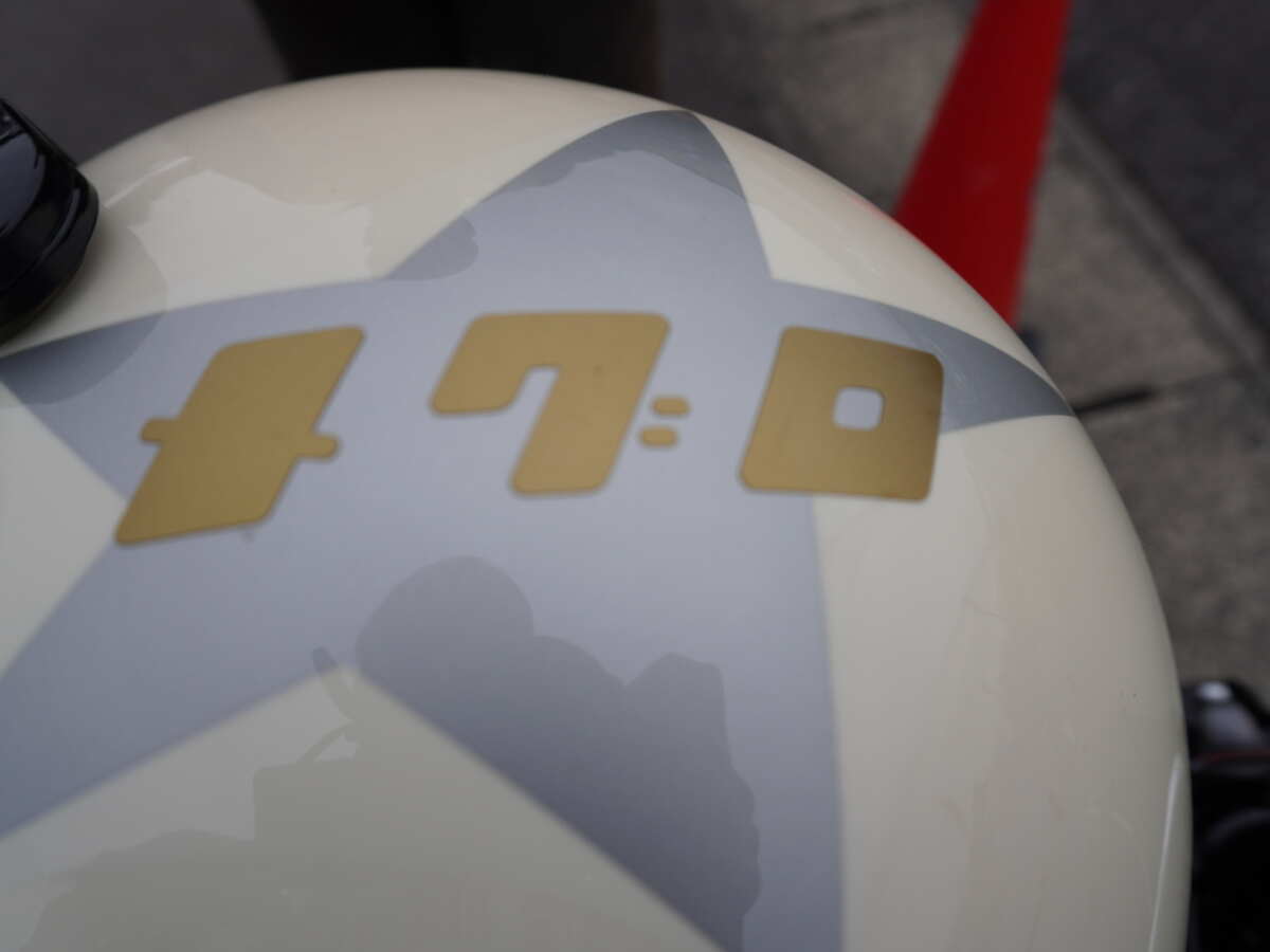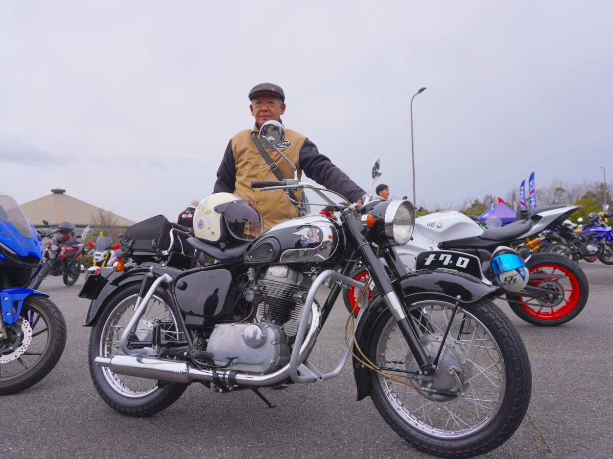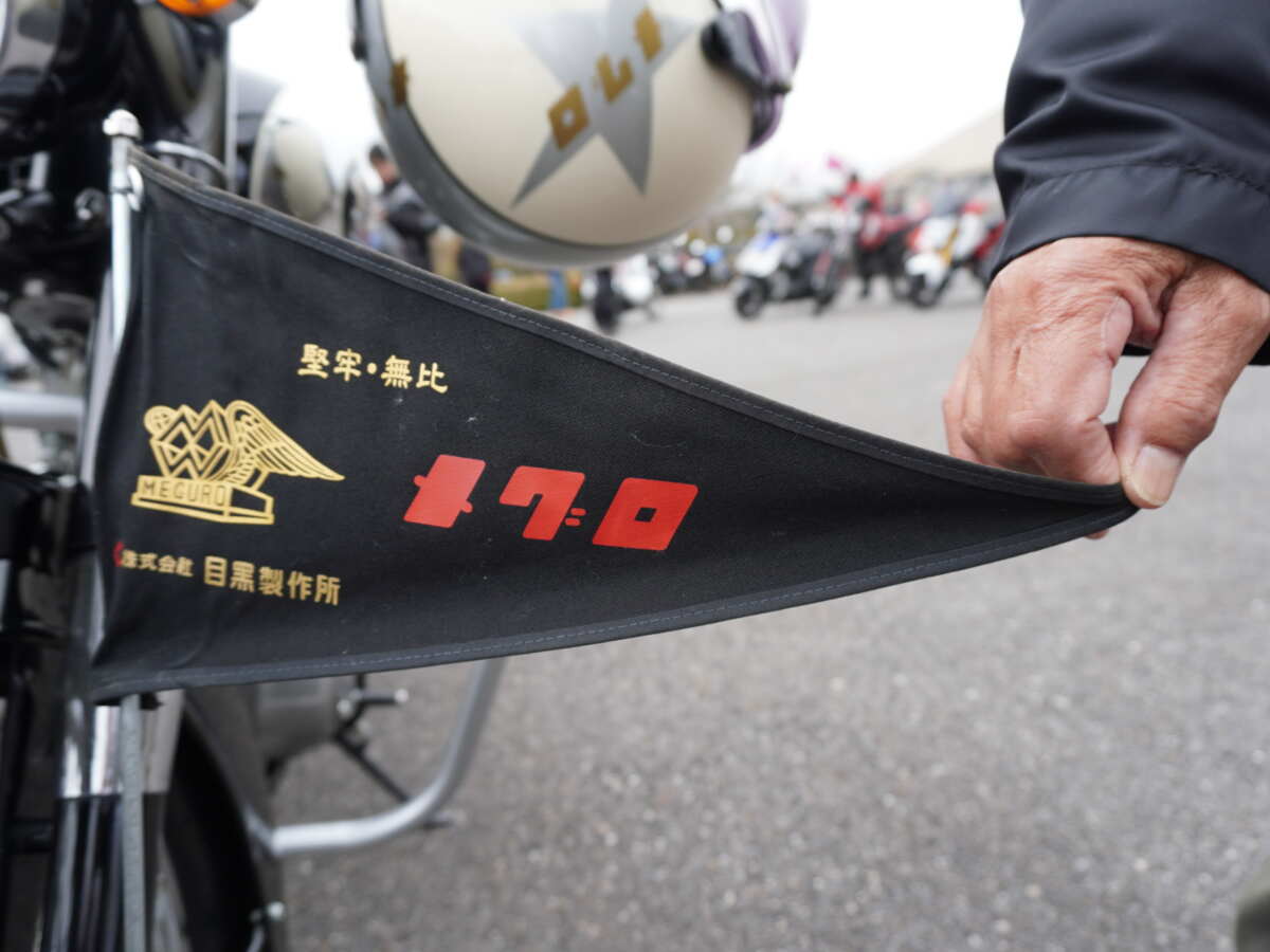 ヘルメットにもメグロとスターマークが描かれていて、愛情たっぷりなのが伝わってきます。