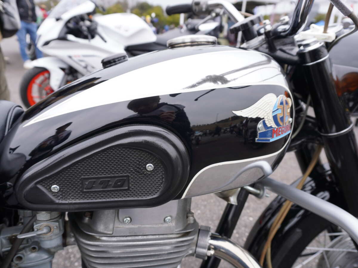いつも通り駐車場を見て回っていると、ダブワン(カワサキW1SA/1971年式)乗りのボクとしては見逃せないオートバイを発見! 『カワサキ250メグロSG』(1965年)ですっ!!