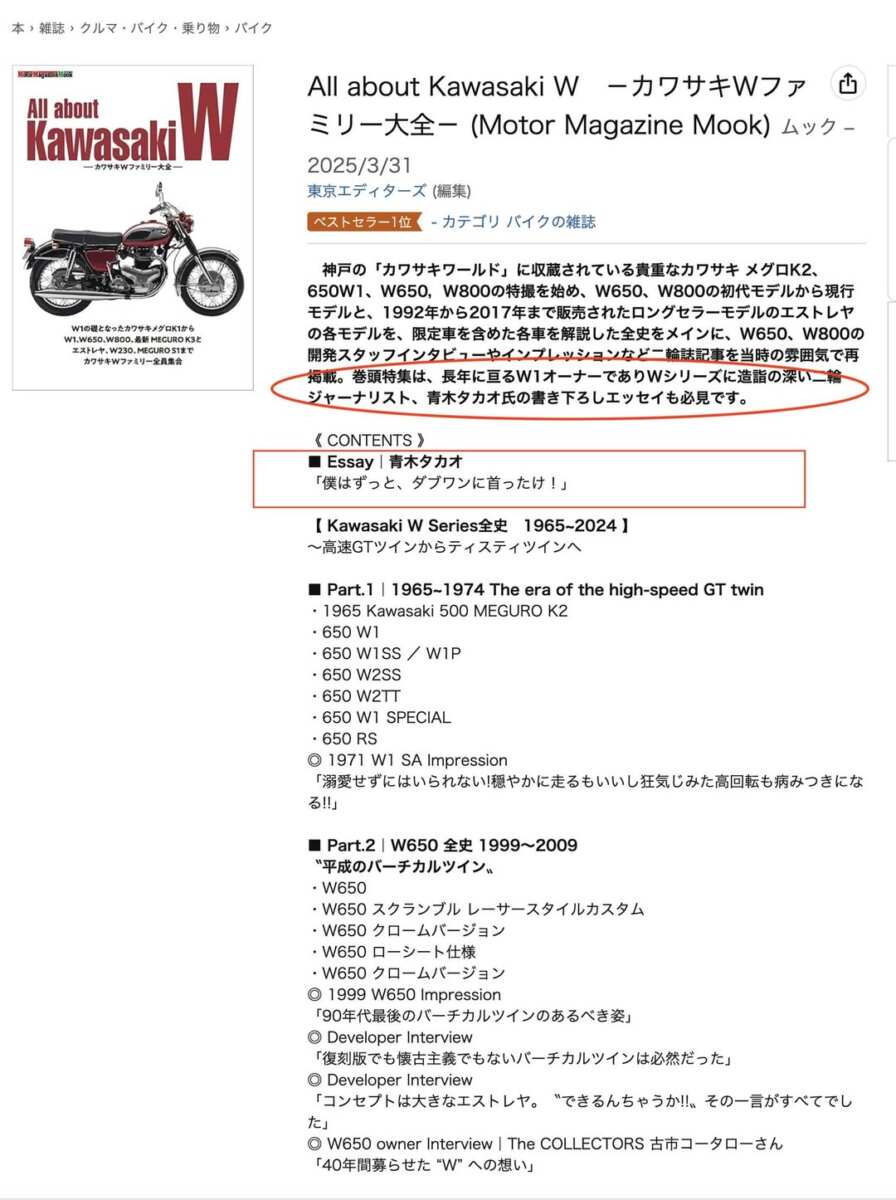 こんにちは青木タカオです。今回、『カワサキWファミリー大全~All about Kawasaki W~』(モーターマガジン社、3月31日発売)に記事を書かせていただきました。