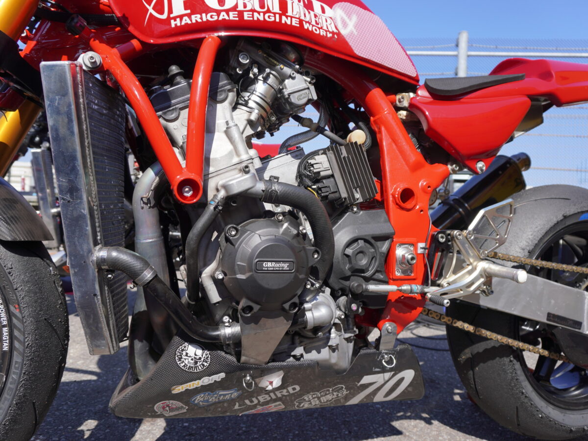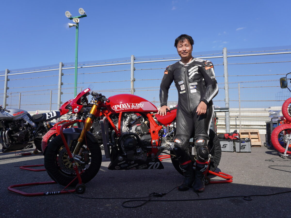 快諾してくださった渡辺一樹選手が、ゼッケン70のマシンの前に立ってくださいます。パワービルダー『Z1000RR』は、カワサキZ1000のスチールフレームをベースにした車体に、ZX-10Rのハイパワーエンジンを積む、これまたT.O.Tならではの怪物マシンです。