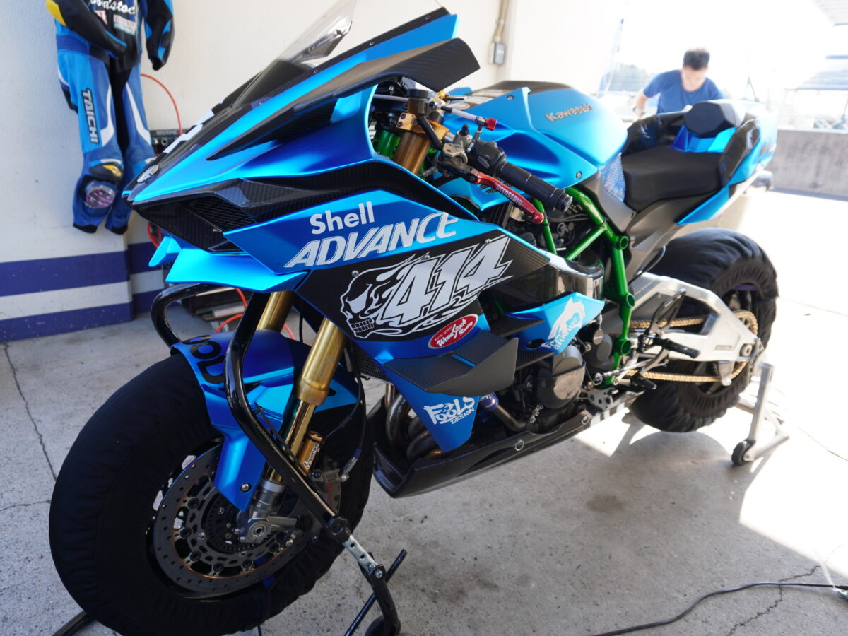 Garage414&WoodStockのブルーのマシンは、スーパーチャージャーを搭載するカワサキ『ニンジャH2R』。これまたモンスターと呼ぶに相応しいハーキュリーズクラスのレーサーです。