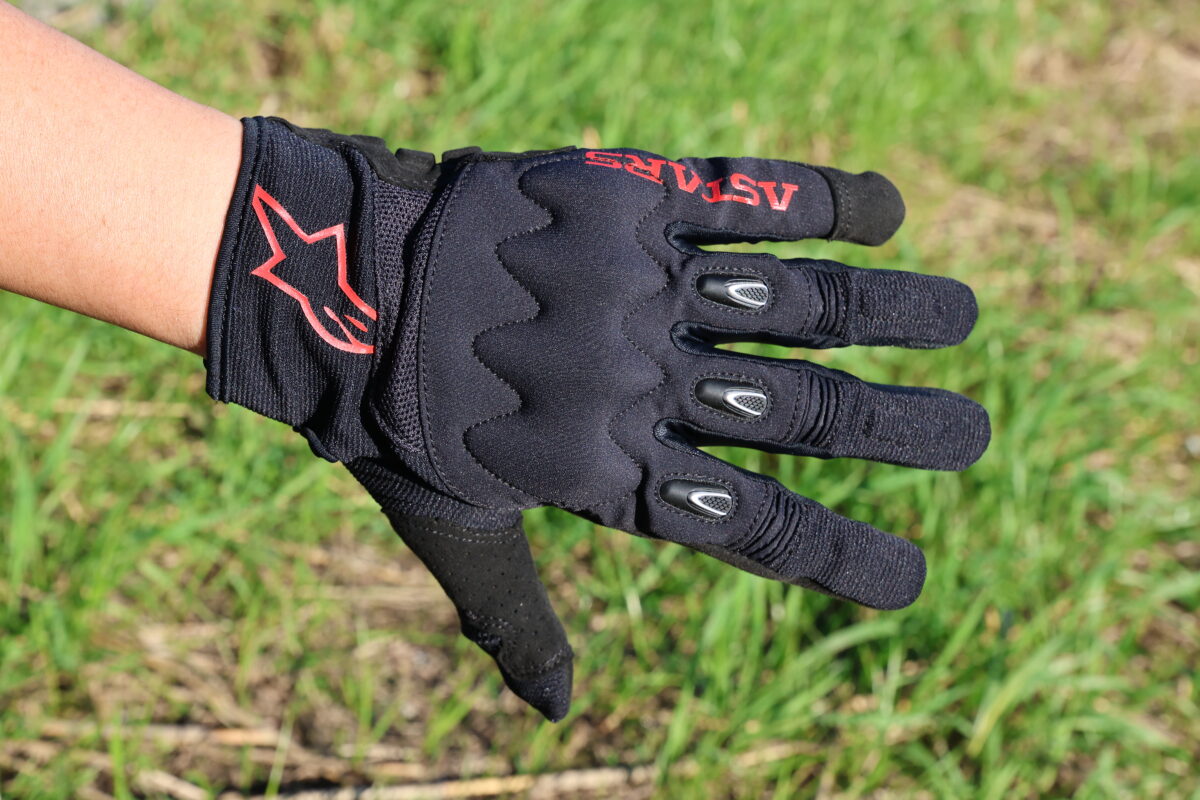 走行速度は遅いがクラッチレバーやブレーキレバーの操作回数が多く、また半クラッチを多用するオフロード用のグローブは薄手なものが多い。写真はアルパインスターズの「Techdura オフロードグローブ」。