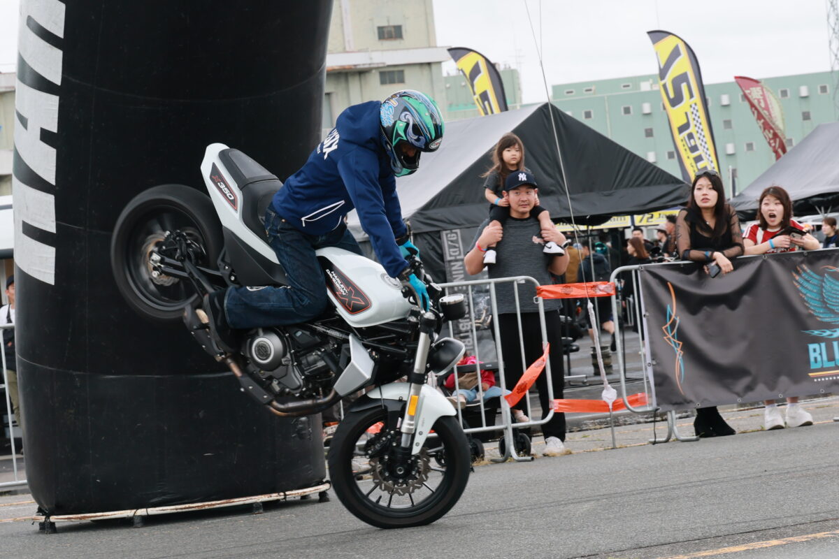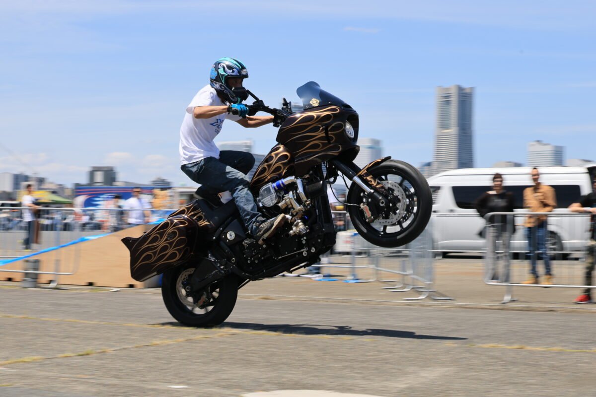 観客たちの目の前で繰り広げられるハーレーを使った迫力のエクストリームライディングショーは迫力満点です。スタントライダーはお馴染み木下真輔さん!