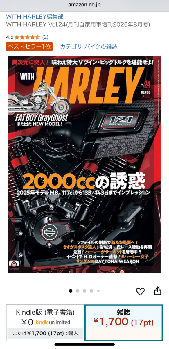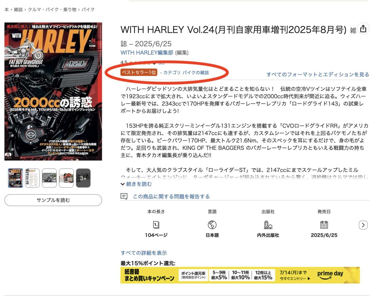 そして1ヶ月半後、ウィズハーレーの最新号が発売となると、なんとなんと! 同じく大手通販サイトでベストセラー1位(バイク雑誌の売れ筋ランキング1位)を発売後から連日続けているではないですかっ!!