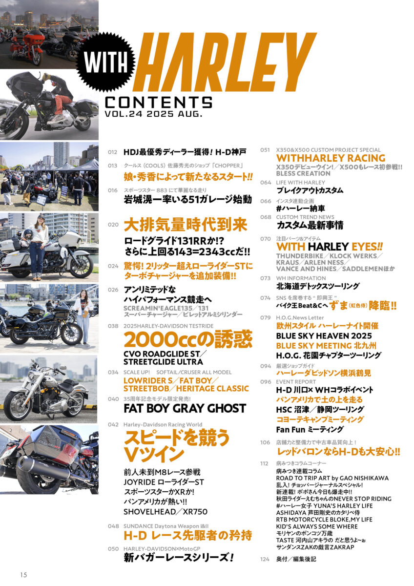 さてさて、その売れ筋ランキング1位の『WITH HARLEY Vol.24』の内容はといえば、巻頭特集はハーレーのVツインエンジンがとにかくデカイということを伝えたくカスタムシーンからお届けいたします。