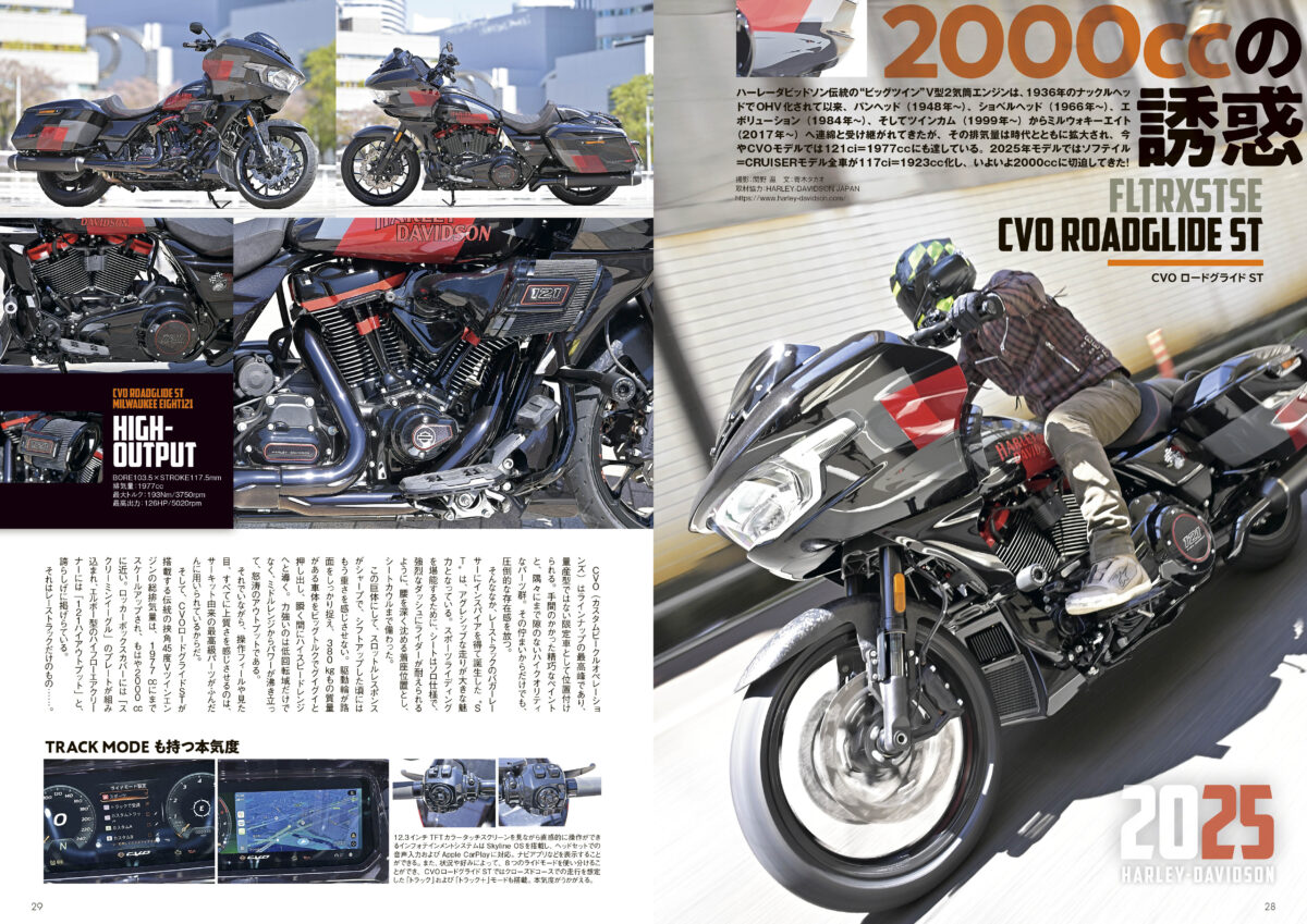 誌面にて特集を組んだ「CVO ロードグライドST」のライドモードには、スーパースポーツさながらのトラック(サーキット)モードまで搭載するのですから、ハーレーのスポーツ路線への意欲は高まるばかりです。