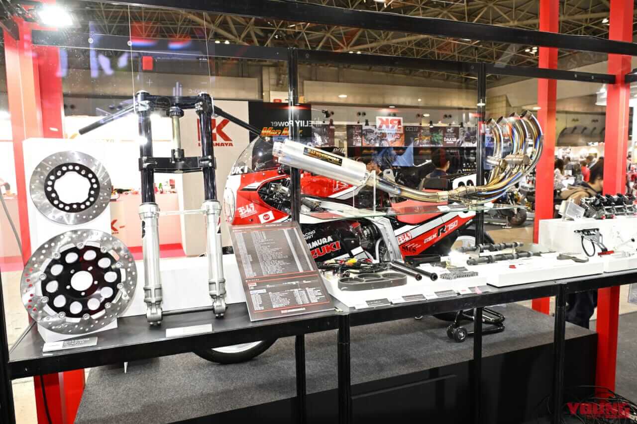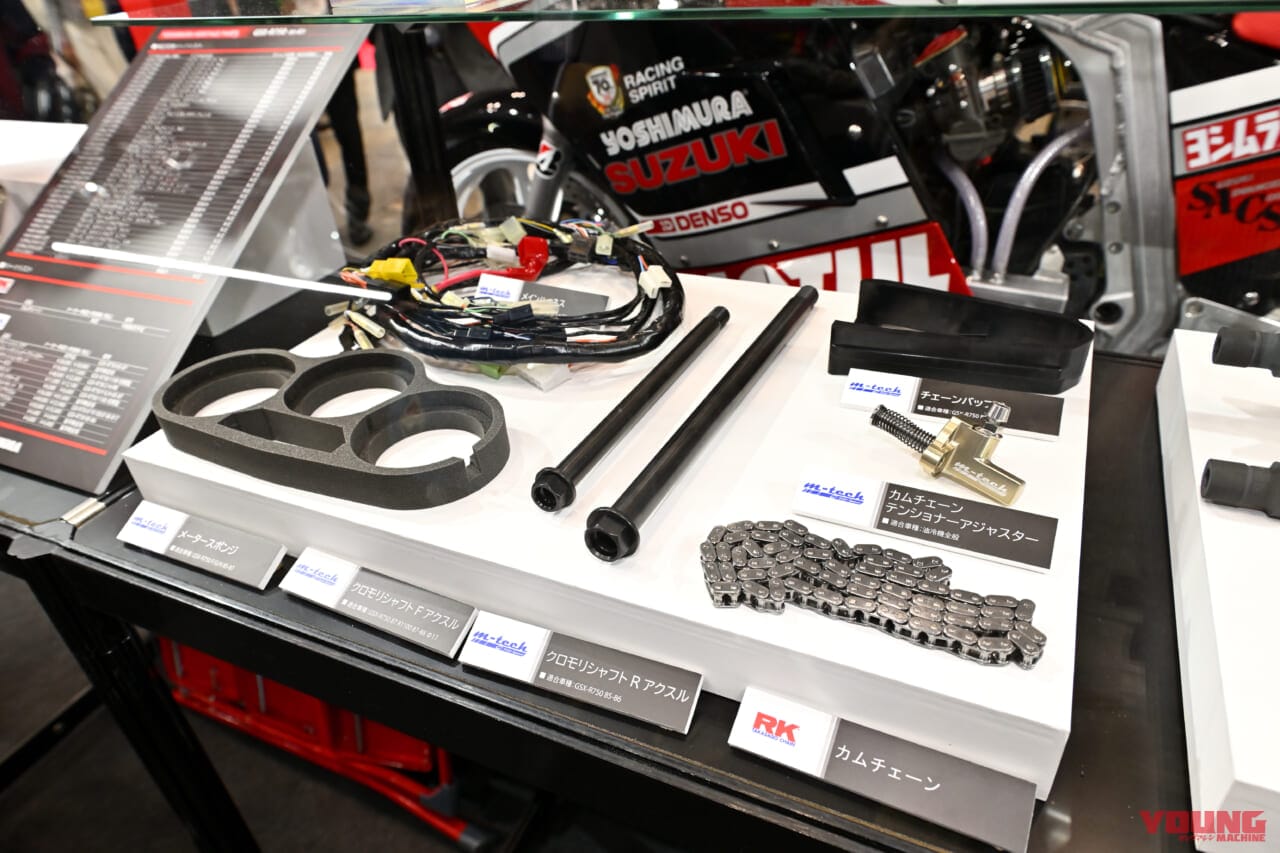 ヨシムラパーツでは、TMR-MJNキャブ/エキゾーストシステム/ST-1カム/フォーククランプASSY/ハンドルバー/ステップなどが油冷GSX-R用に新作される予定。これは次で紹介するコンプリート車製作に必要といった理由も含まれている。