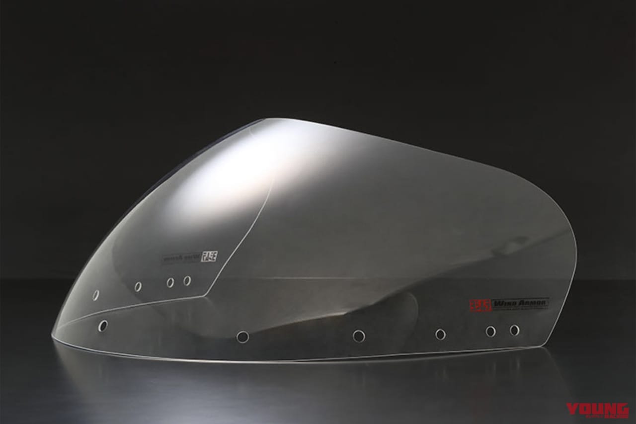 初期型油冷スタイルを崩さない、純正とほぼ同形状のスクリーンは製品名「ウィンドアーマー」として2万2000円で発売中。初期型GSX-R750だけでなく、同じく初期型GSX-R1100(1986〜88年式)にも適合する。