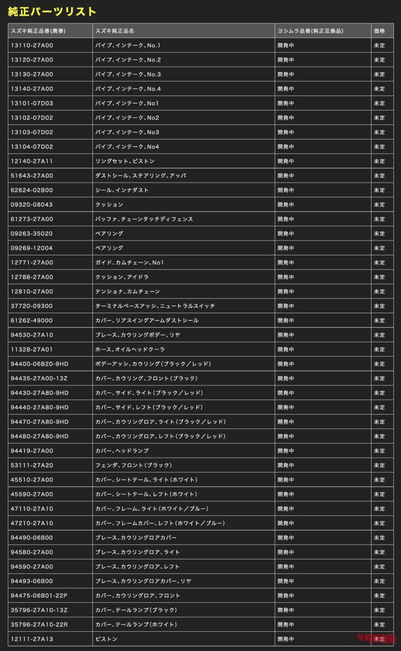 ヨシムラのWEBサイトに掲載される42点の復刻予定パーツのリスト。いずれも開発中のため発売時期や価格は未定。続報を待て!