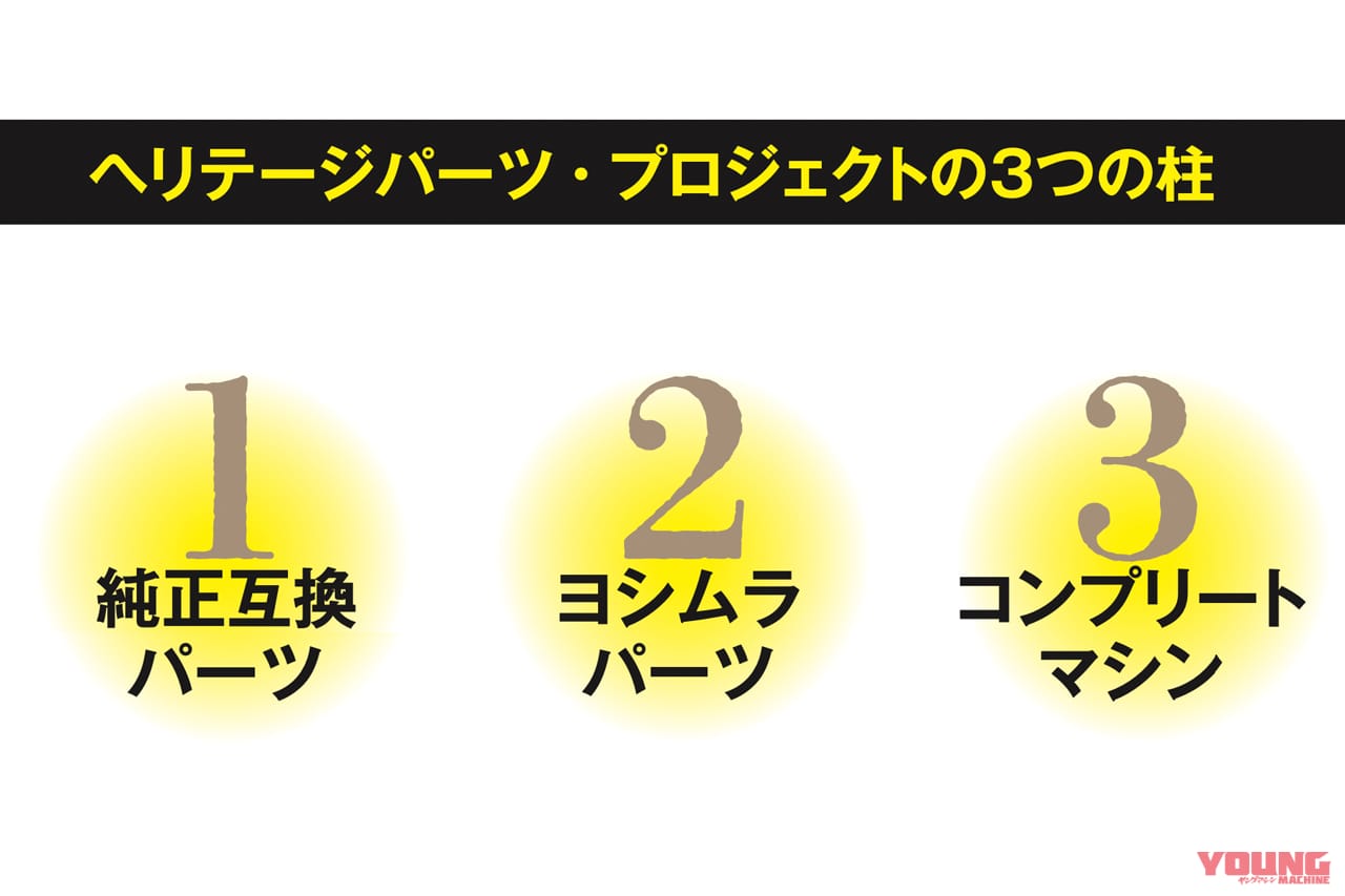 ヨシムラの「ヘリテージパーツプロジェクト」は3段構え。まずは廃盤となった純正部品をヨシムラが復刻/再生産する①の「純正互換パーツ」。レストア需要の高まりに対し、ユーザーの長期的な車両維持を支援する。そして②の「ヨシムラパーツ」では、マフラー/エンジン/シャーシパーツなど車種別設計のヨシムラ製パーツを拡充し、ユーザーの「愛車をもっと楽しく走らせたい」という想いをサポート。 それらを活かしつつ社外のカスタムパーツも併用し、ヨシムラの手でコンプリートカスタムされたマシンが③となる。