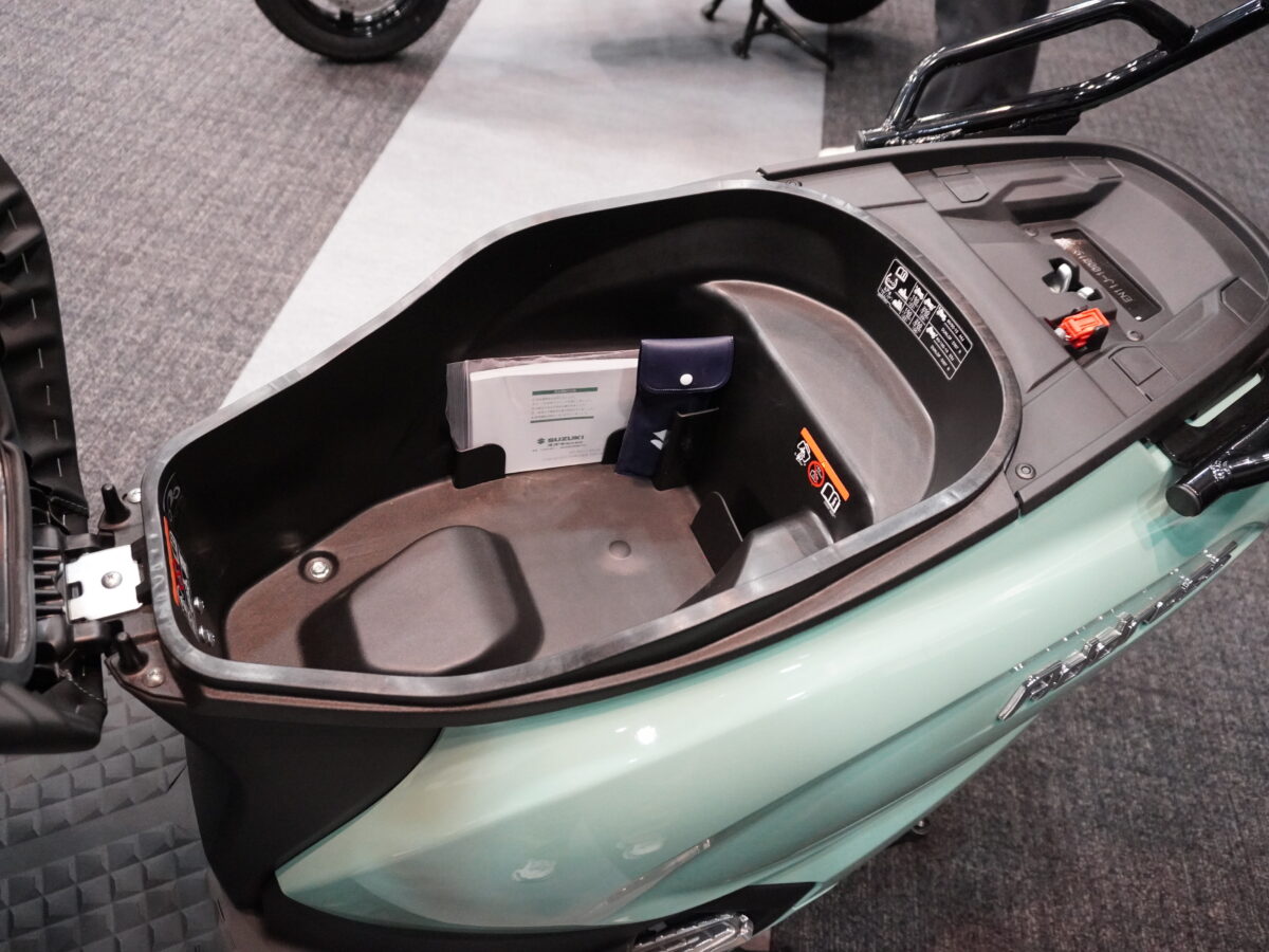シート下のトランクスペースも容量アップ(24.4L)しています。前方(先端)にヘルメットフックが2つあるのは変わりません。ボクはこれを重宝しています。