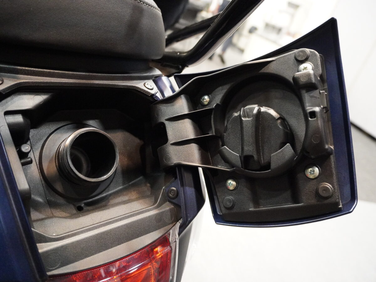 新型はリッドをつけて開閉式に。イグニッションキーで開けることができ、まるでクルマのような給油口に進化を果たしています。