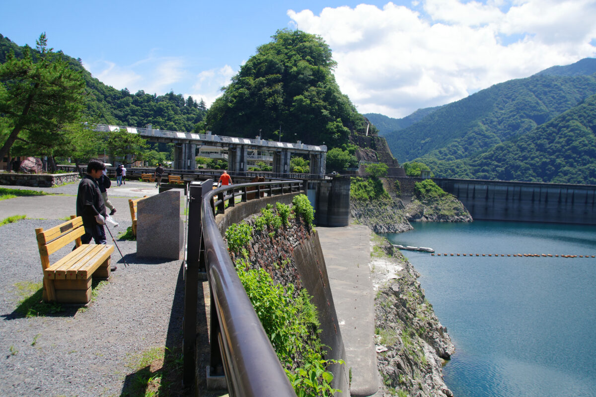 ▲“ふれあい館”の周辺で、小河内ダムを見下ろしながら清掃活動を行う参加者
