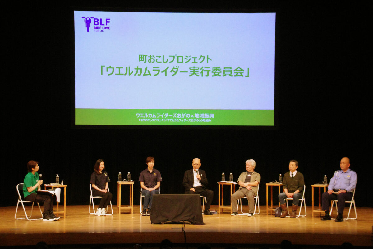 「ウエルカムライダーズおがの×地域振興 まちおこしプロジェクト『ウエルカムライダーズおがの』の取組み」と題したトーク対談では、2005年に両神村(りょうかみむら)との合併を機に始まった地域活性化を目的としたライダー誘致「オートバイによる町おこし」事業(2006年事業開始)の関係者が揃って登壇した。