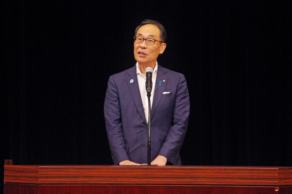 ▲開催自治体からの挨拶を述べる埼玉県の大野元裕知事。「世界トップクラスの品質や知名度を誇るヘルメットメーカーも県内に本社を置いており、本県とバイク産業にはかねてより深いものがあります。ライダーの皆様におかれましてはぜひジェントルな走行で、小鹿野町、秩父地域をはじめ県内各地を巡り、埼玉県の魅力を満喫いただければと思います(要約)」