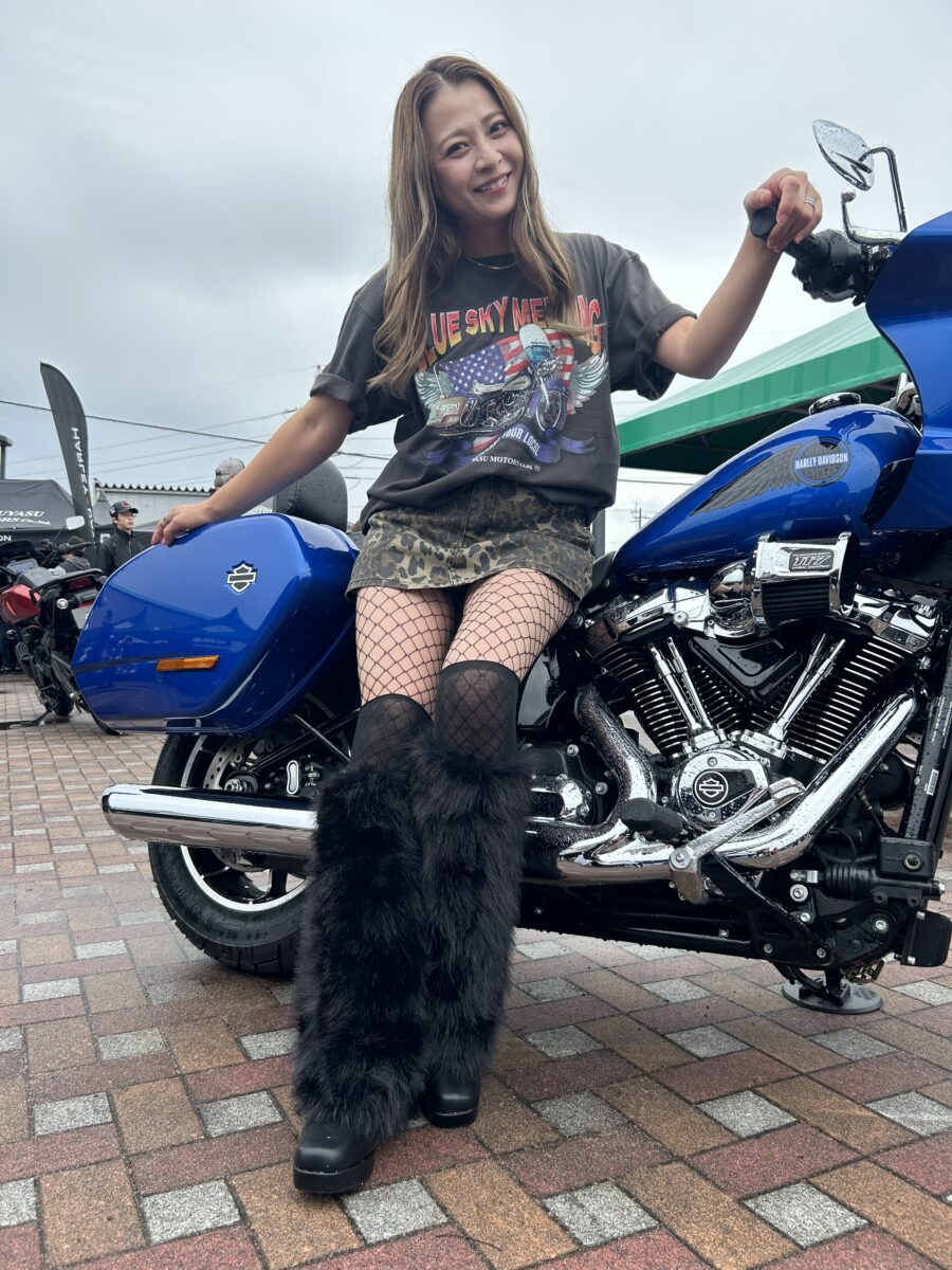 CVOストリートグライドに乗るYUNA(ゆうな)さんもまた大阪出身で、イベント会場が地元にほど近い。ウィズハーレーの巻末コラム『YUNA'S HARLEY LIFE』を執筆中で、全国を駆け回るツアラー女子です。仲間を連れて、遊びに来てくれました。