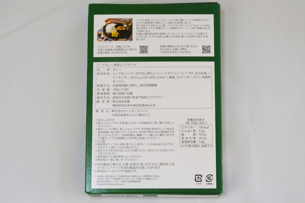 ↑原材料はインド産ムング豆、ほうれん草ピューレー、トマト・ピューレーづけ、なたね油、ソテーオニオン、おろししょうが、おろしにんにく、食塩、コリアンダー、クミン、赤唐辛子、ウコン。ほうれん草が入っているためかカロリーは最も低い181kcal。